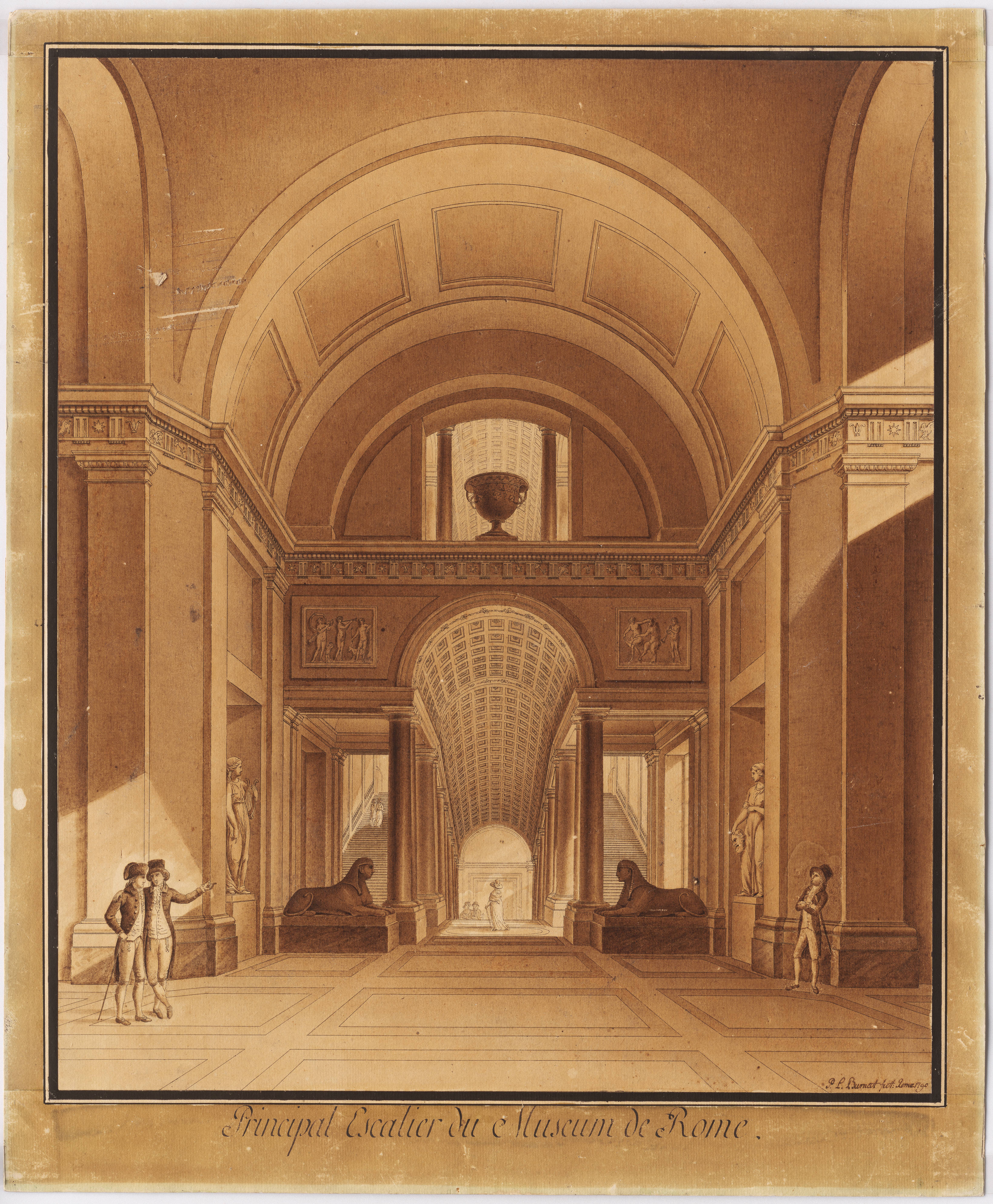 Architektonisches Glanzstück der nach den beiden auftraggebenden Päpsten Museo Pio Clementino benannten Räume war die Treppe. Die steile, bis auf ihre Staffagefiguren streng symmetrische Zentralperspektive zieht den Blick in die Tiefe des Raumes, den Burnat mit sicherem Gespür für die Wirkung im Hell-Dunkel seiner Darstellung zusätzlich betont. Die Zeichnung folgt äußerlich in ihren braun-beigen Tonstufen der neusten Mode und ist à la sépia ausgeführt. Die 1778 in Rom unter Verwendung getrockneter Tintenfischtinte entwickelte neuartige Sepia-Zeichentechnik erfreute sich sehr schnell steigender Beliebtheit und wurde oft günstig in Aquarell nachgeahmt.