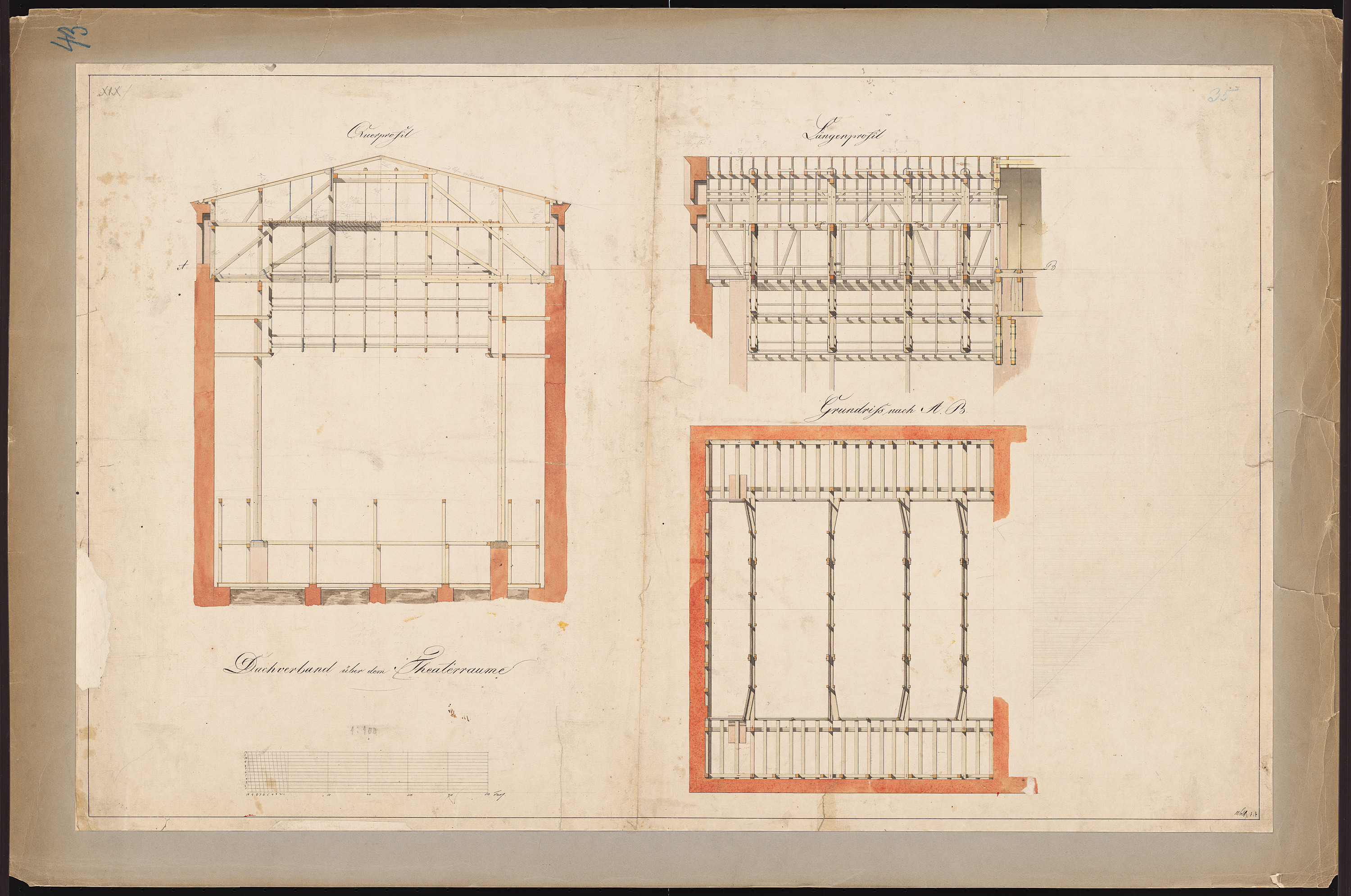 Bühnenhaus: Dachverband: Grundriss, Querschnitt u. Längsschnitt