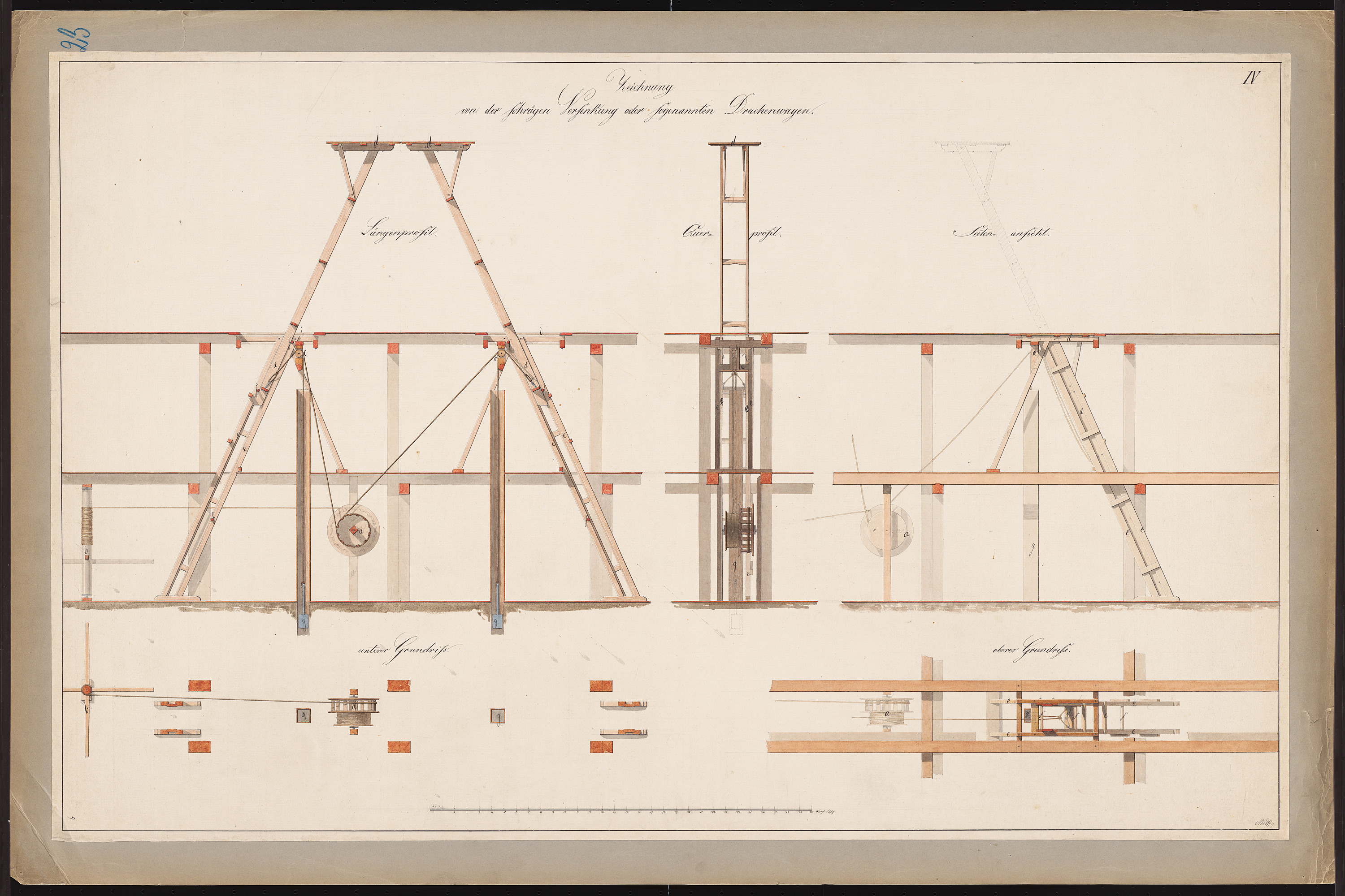 Bühnenhaus: Schräge Versenkung (Drachenwagen), Grundrisse, Schnitte, Ansicht