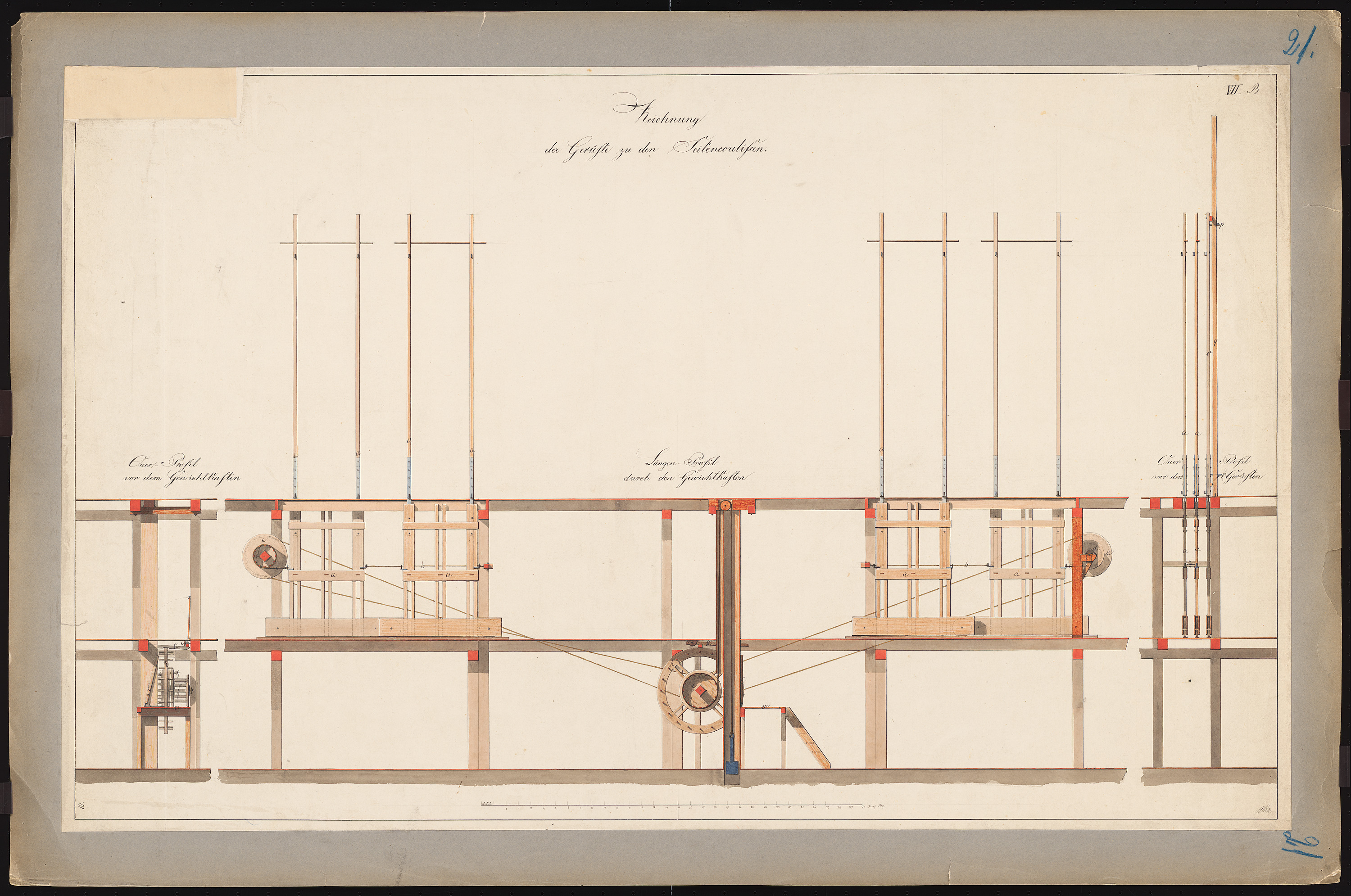 Bühnenhaus: Gerüste zu Seitenkulissen, Schnitte