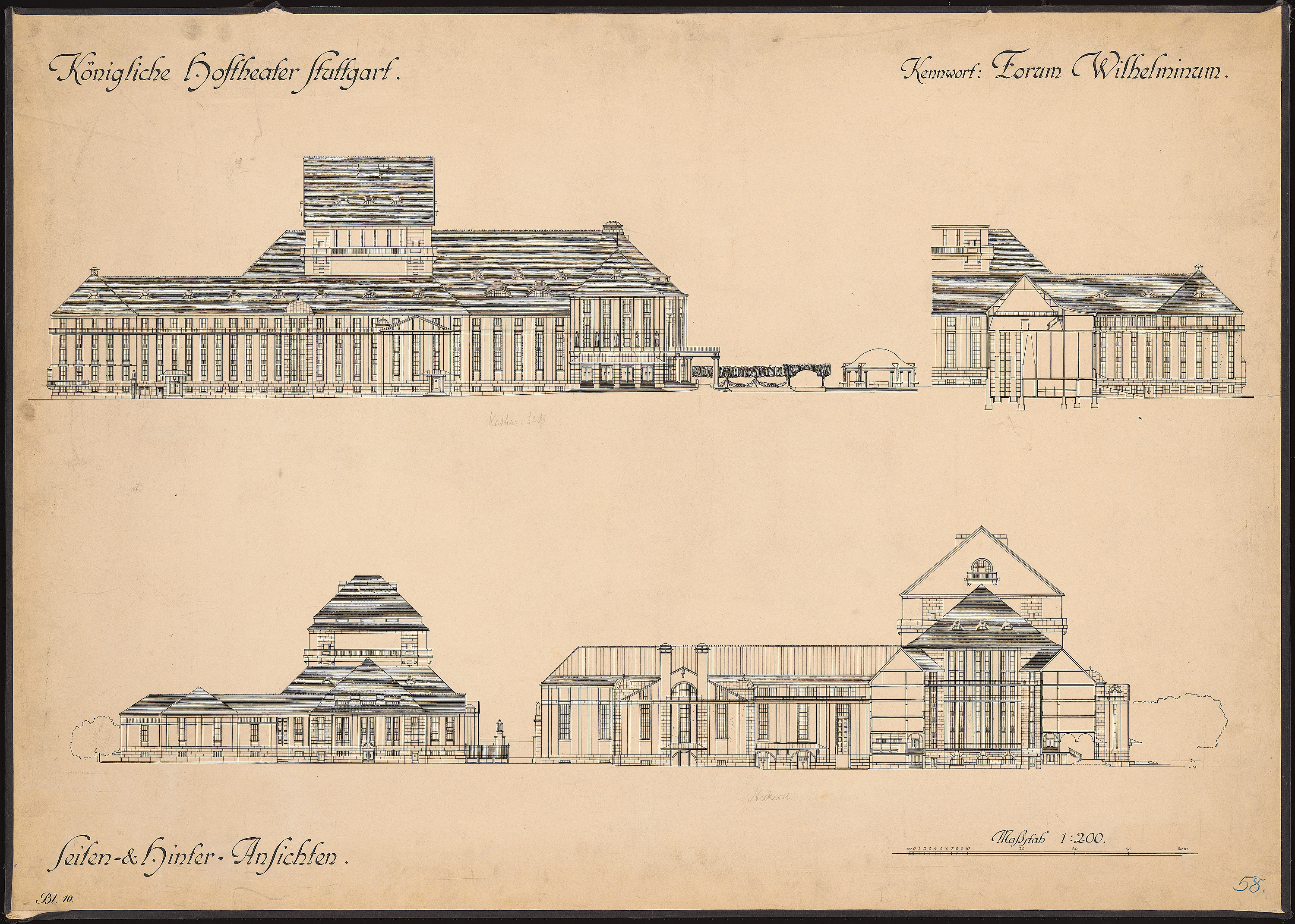 Seitenansichten und Teilschnitt des großen und kleinen Theaters 1:200