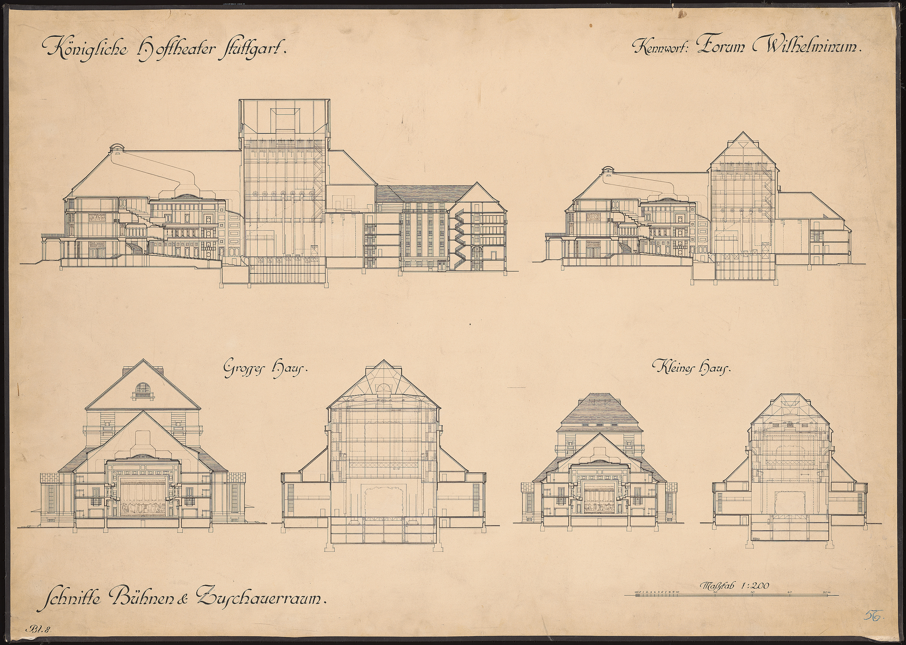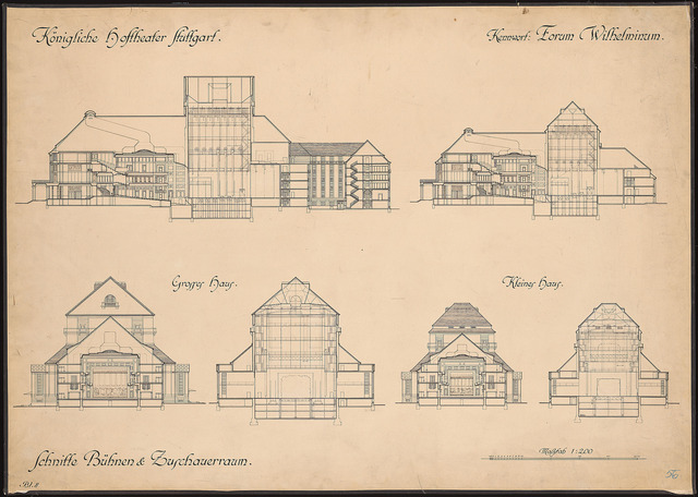 Je ein Längsschnitt und 2 Querschnitte des großen und kleinen Theaters 1:200