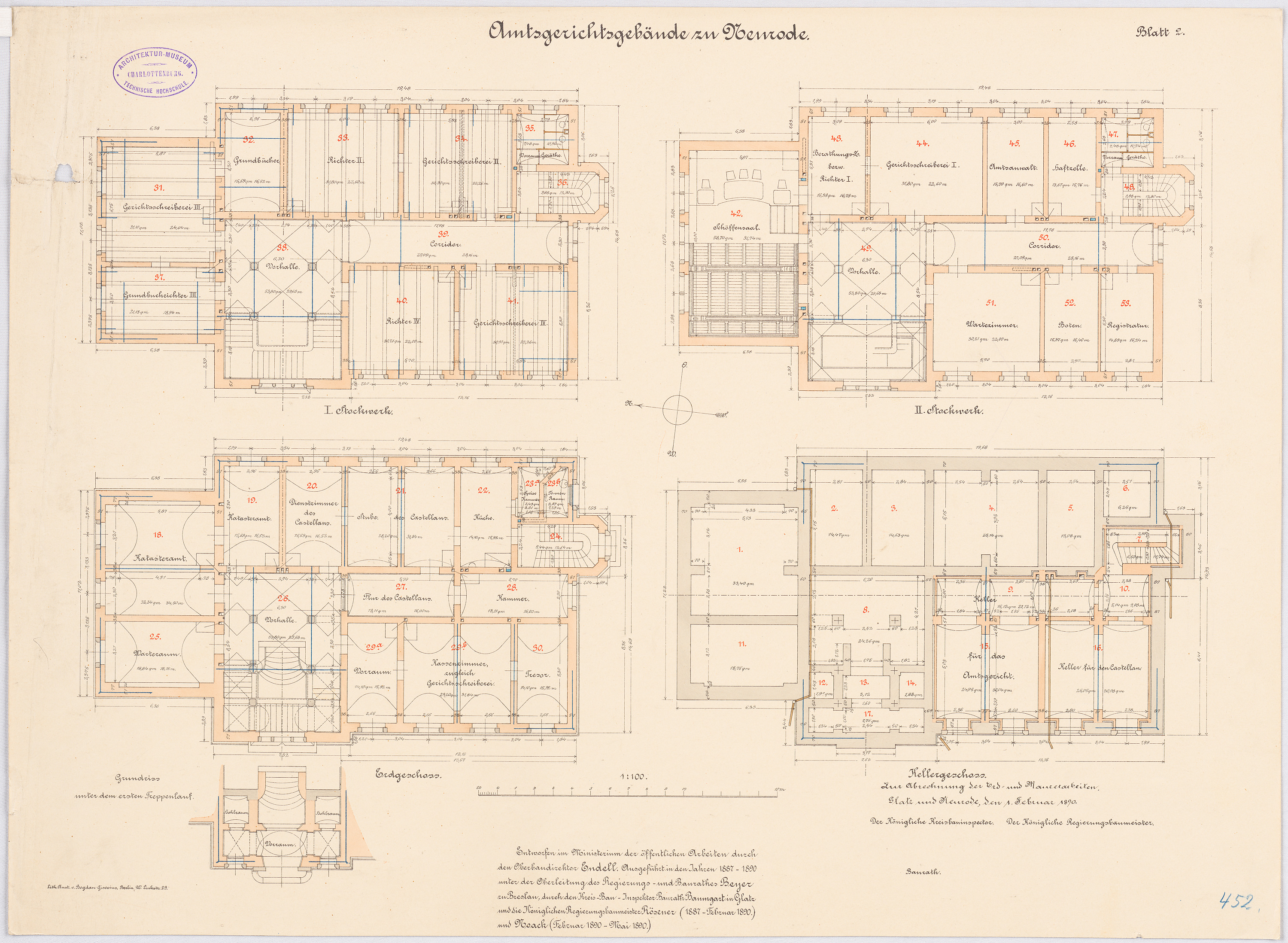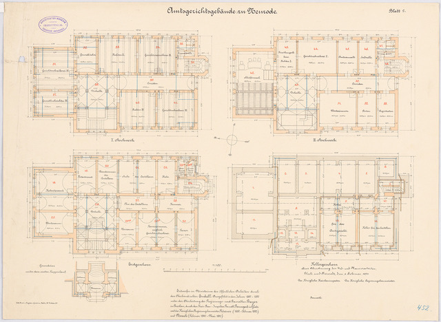 Gericht: Grundriss Keller, Erdgeschoss, 1. und 2. Obergeschoss 1:100