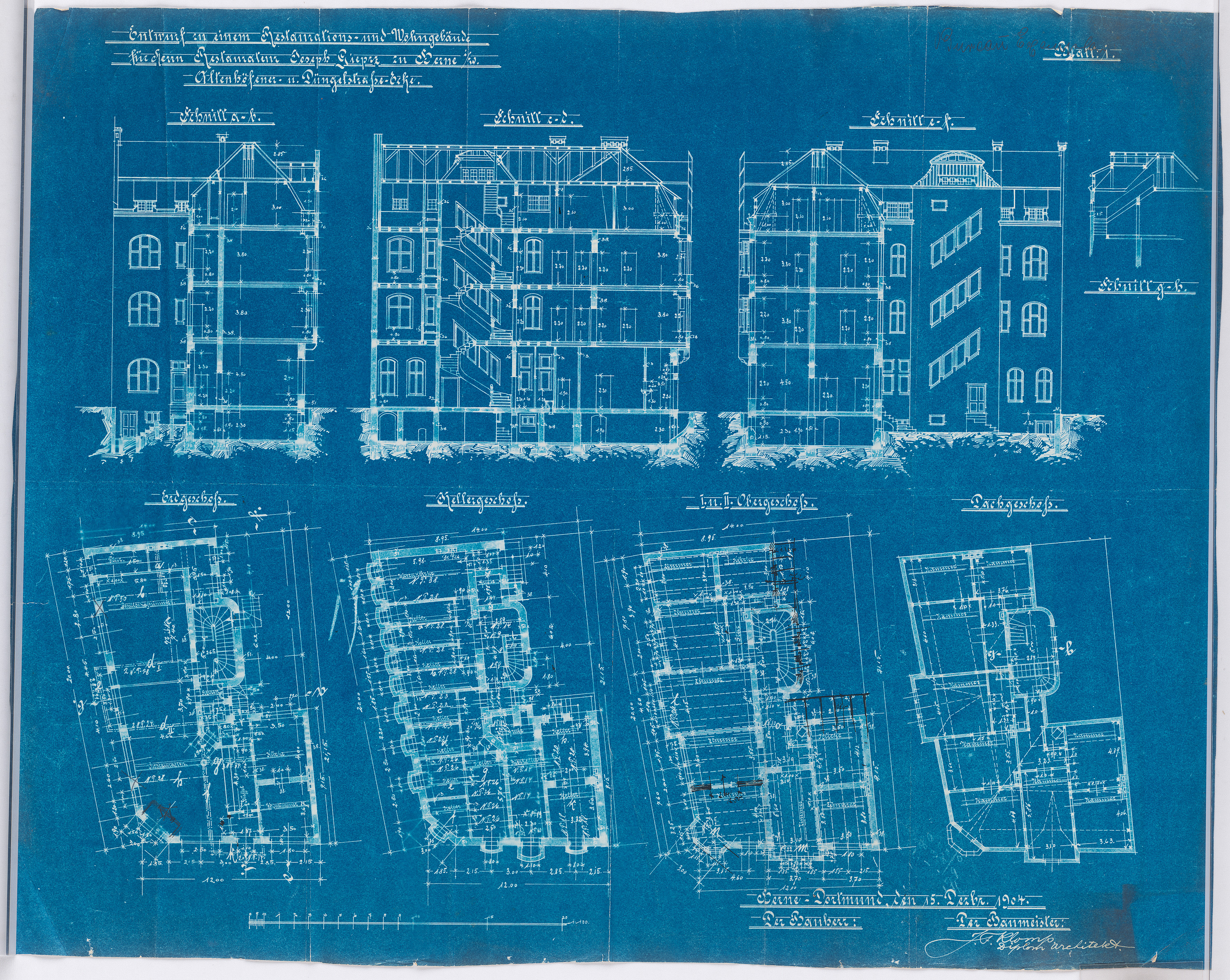 Lichtpause Einzeichnung: Tusche, Bleistift über Blaupause auf Papier