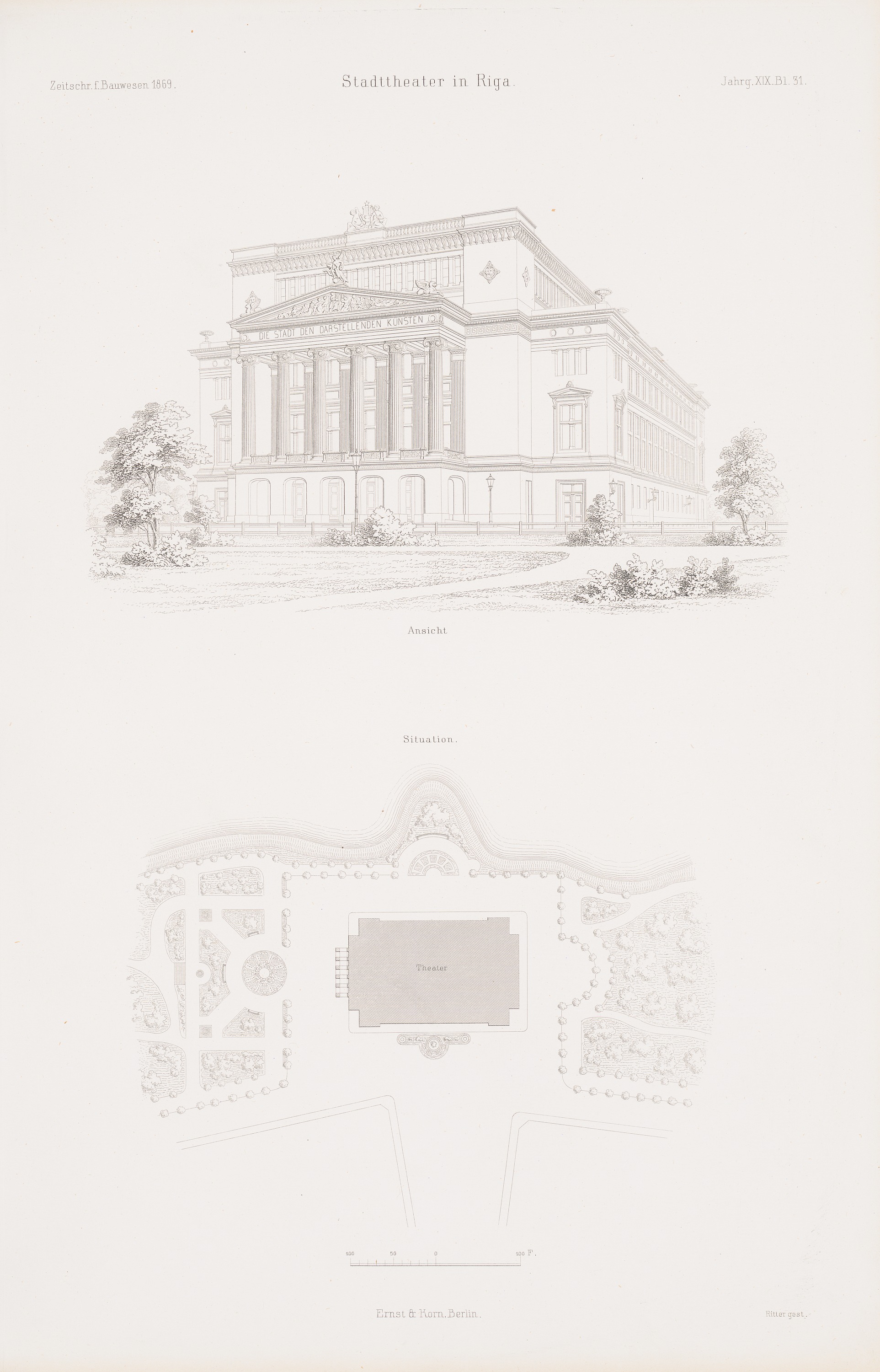 Lageplan, Perspektivische Ansicht (aus: Atlas zur Zeitschrift für Bauwesen, hrsg. v. G. Erbkam, Jg. 19, 1869)