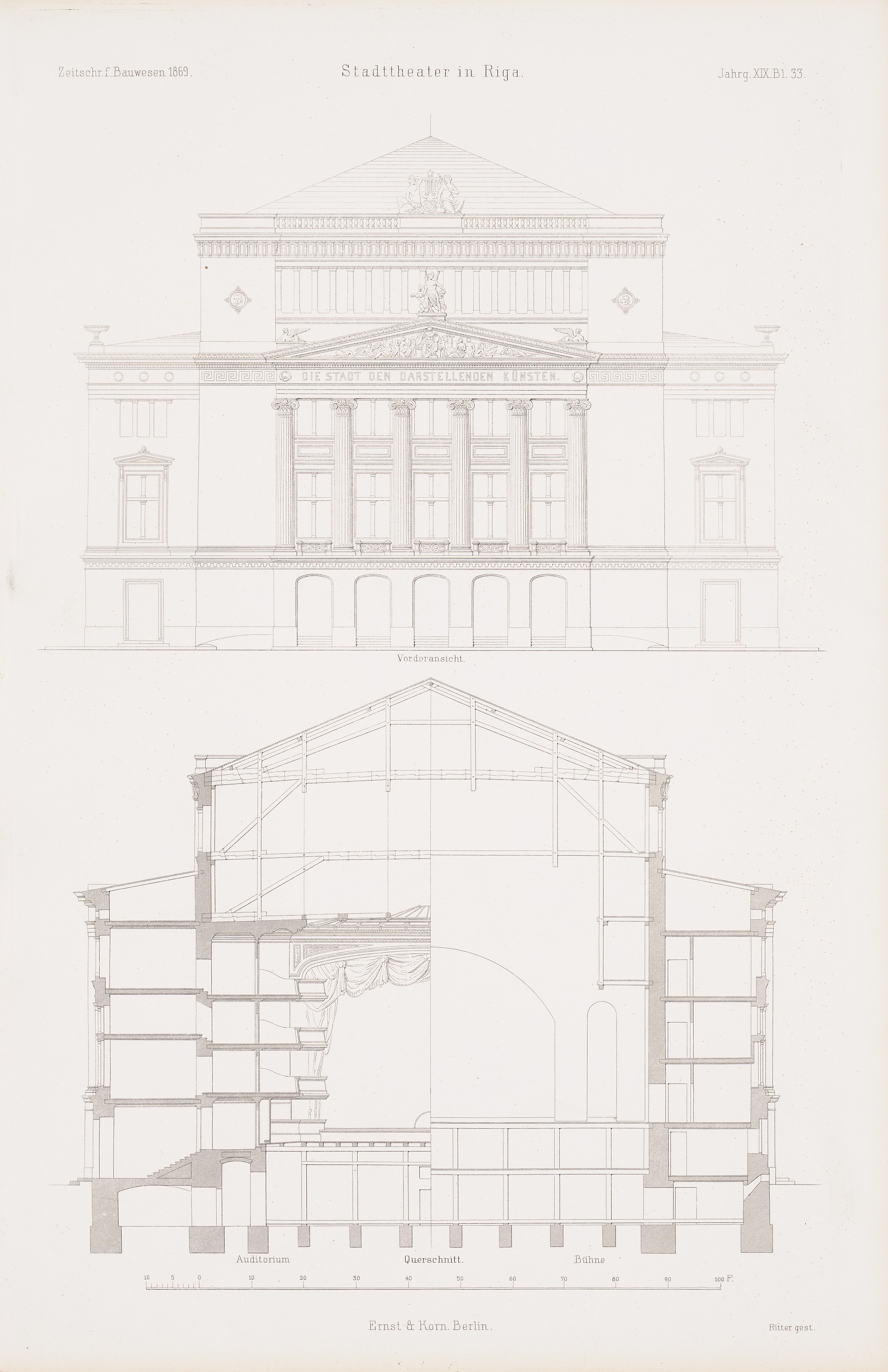 Vorderansicht, synoptischer Schnitt durch Auditorium und Bühne (aus: Atlas zur Zeitschrift für Bauwesen, hrsg. v. G. Erbkam, Jg. 19, 1869)