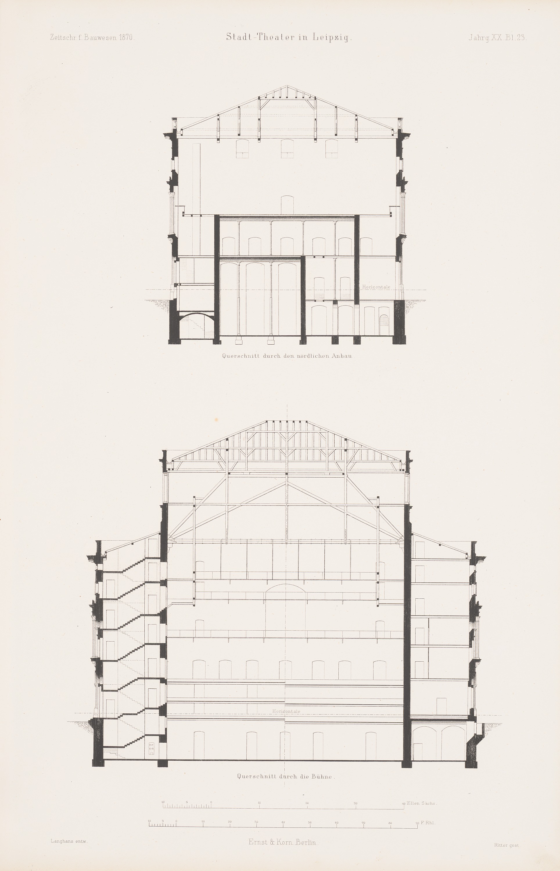 Querschnitt nördlicher Anbau, Bühne (aus: Atlas zur Zeitschrift für Bauwesen, hrsg. v. G. Erbkam, Jg. 20, 1870)