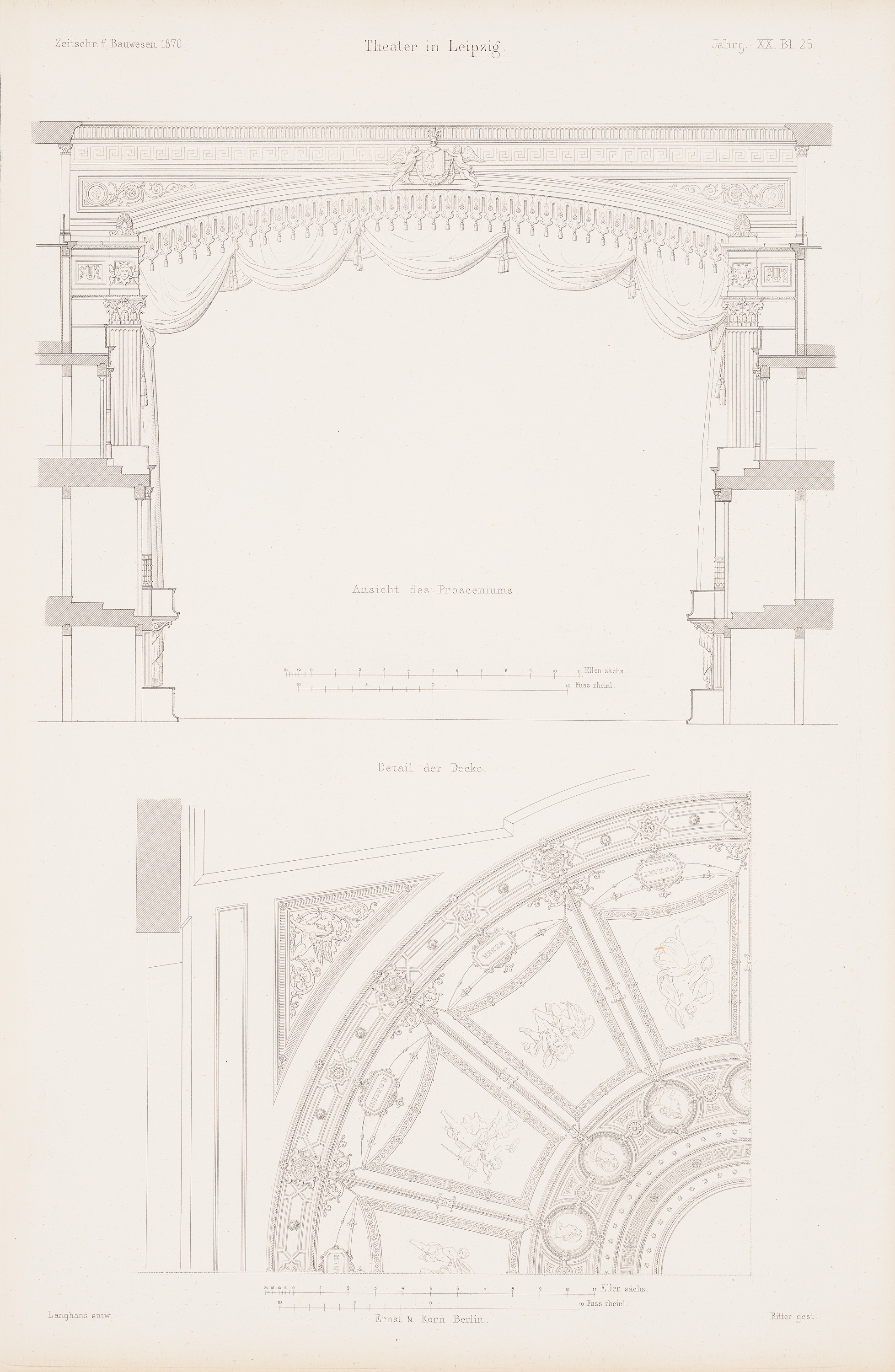 Ansicht Bühne, Detail Decke (aus: Atlas zur Zeitschrift für Bauwesen, hrsg. v. G. Erbkam, Jg. 20, 1870)