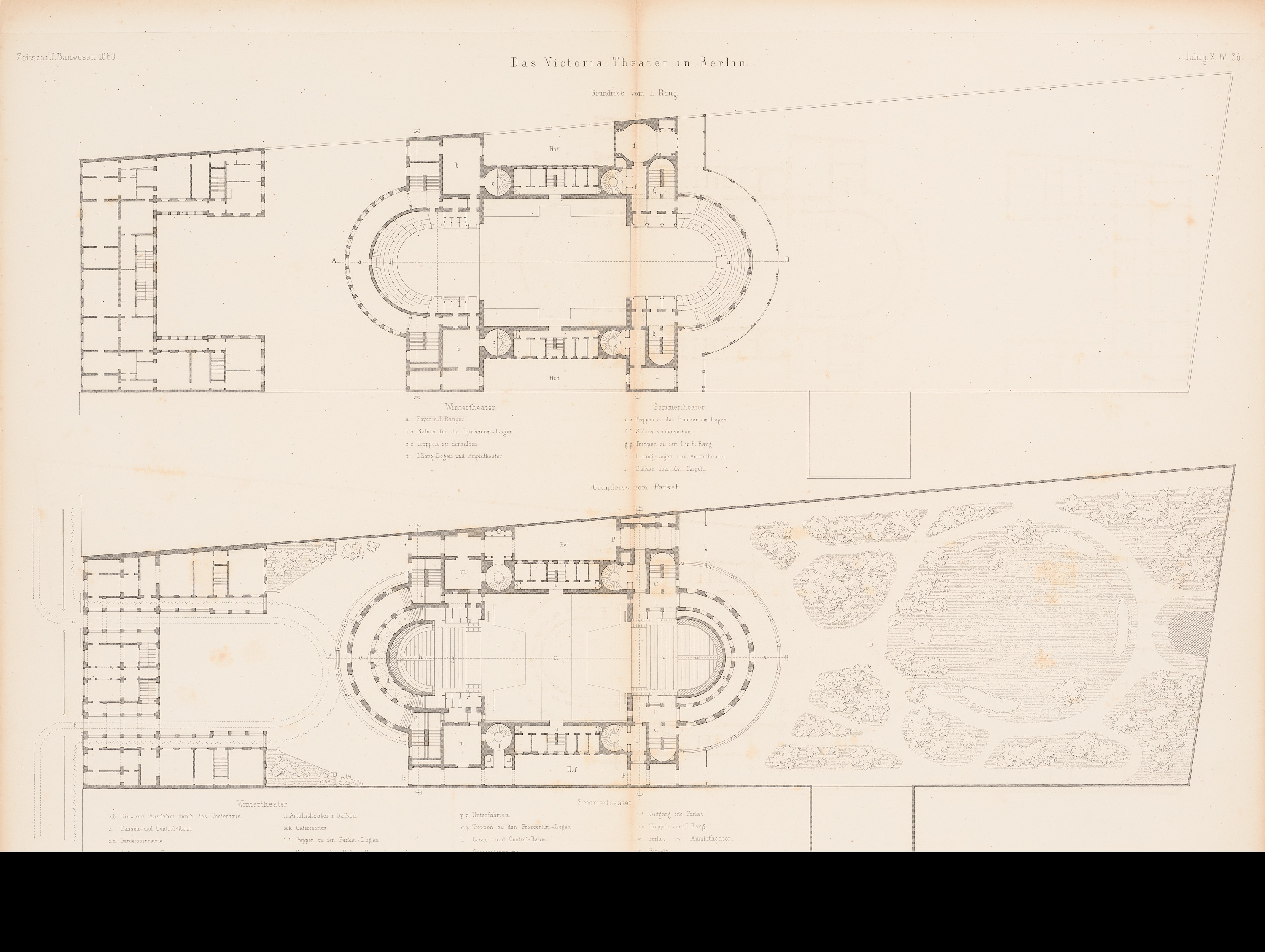 Grundriss Parkett, 1.OG (aus: Atlas zur Zeitschrift für Bauwesen, hrsg. v. G. Erbkam, Jg. 10, 1860)