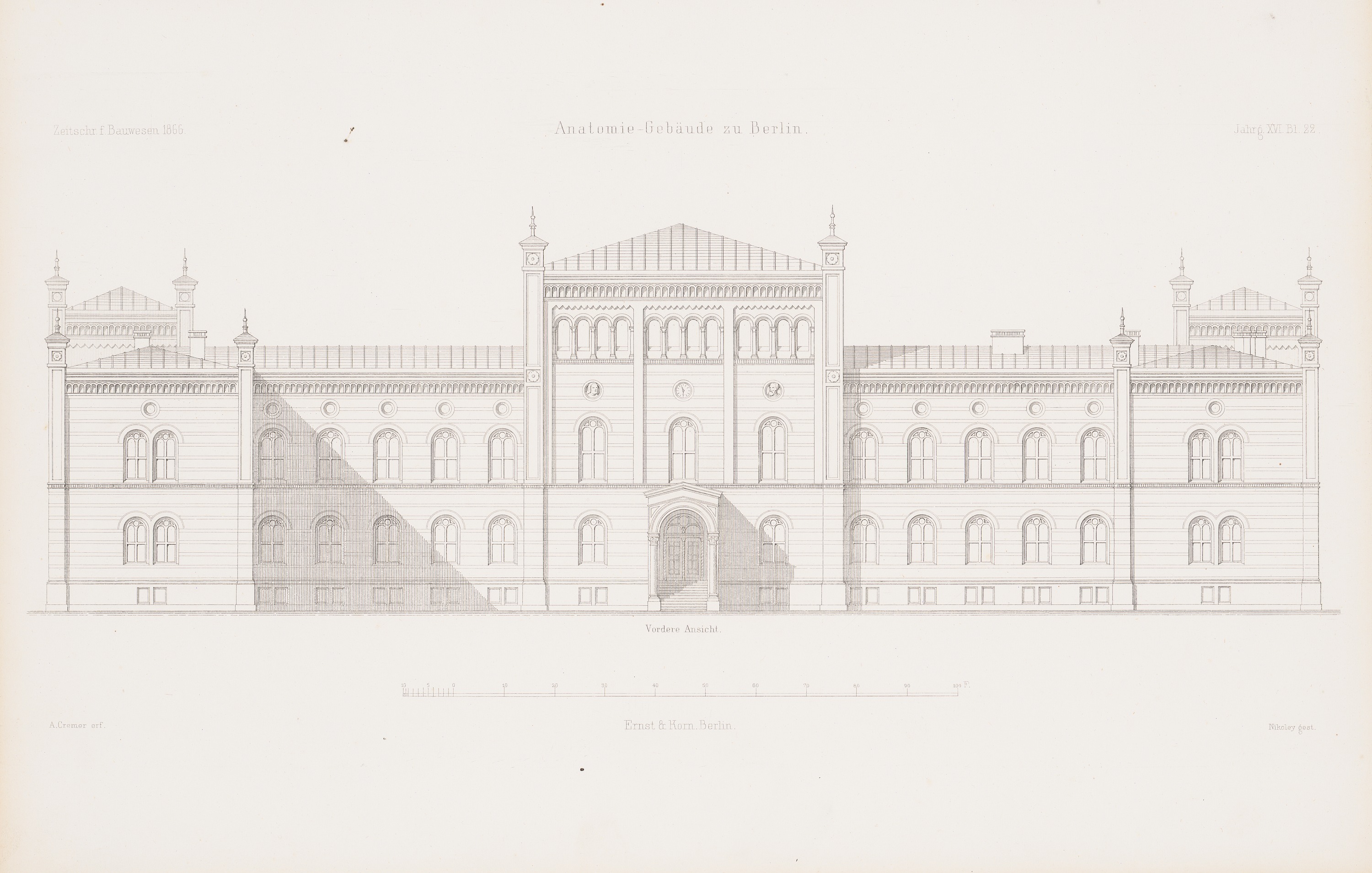 Vorderansicht (aus: Atlas zur Zeitschrift für Bauwesen, hrsg. v. G. Erbkam, Jg. 16, 1866)