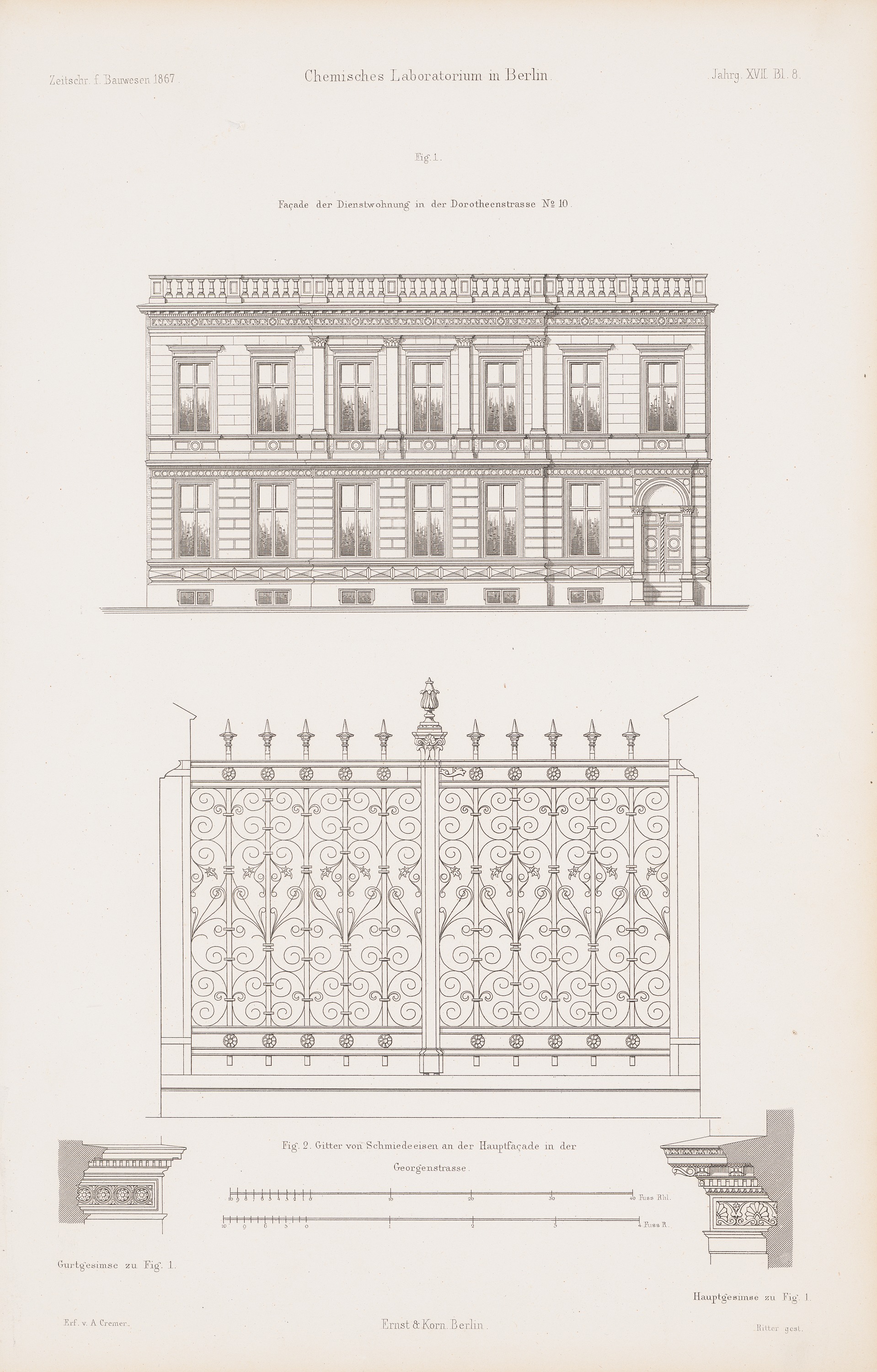 Ansicht, Details Dienstwohnung (aus: Atlas zur Zeitschrift für Bauwesen, hrsg. v. G. Erbkam, Jg. 17, 1867)
