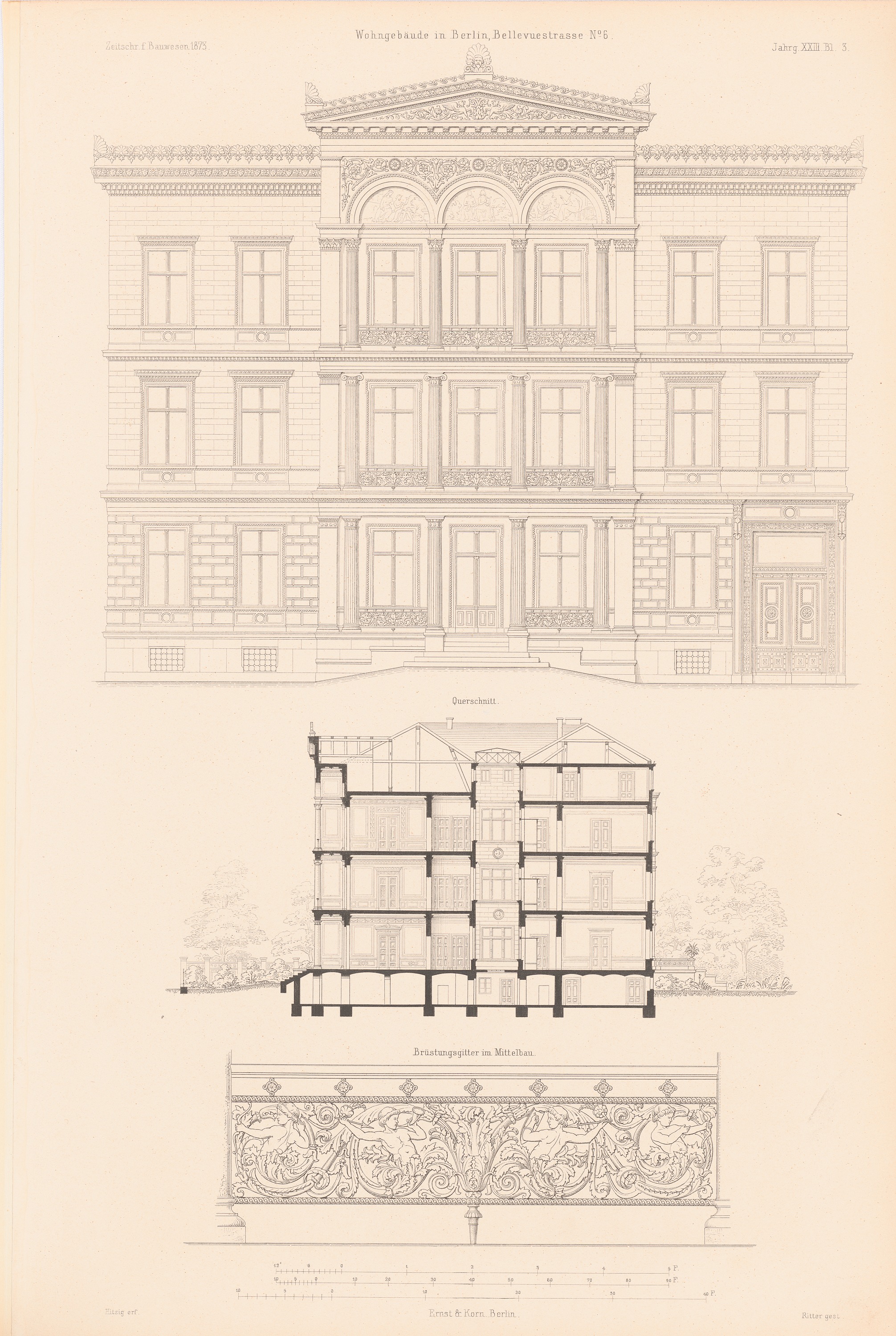 Ansicht, Querschnitt, Detail (aus: Atlas zur Zeitschrift für Bauwesen, hrsg. v. G. Erbkam, Jg. 23, 1873)