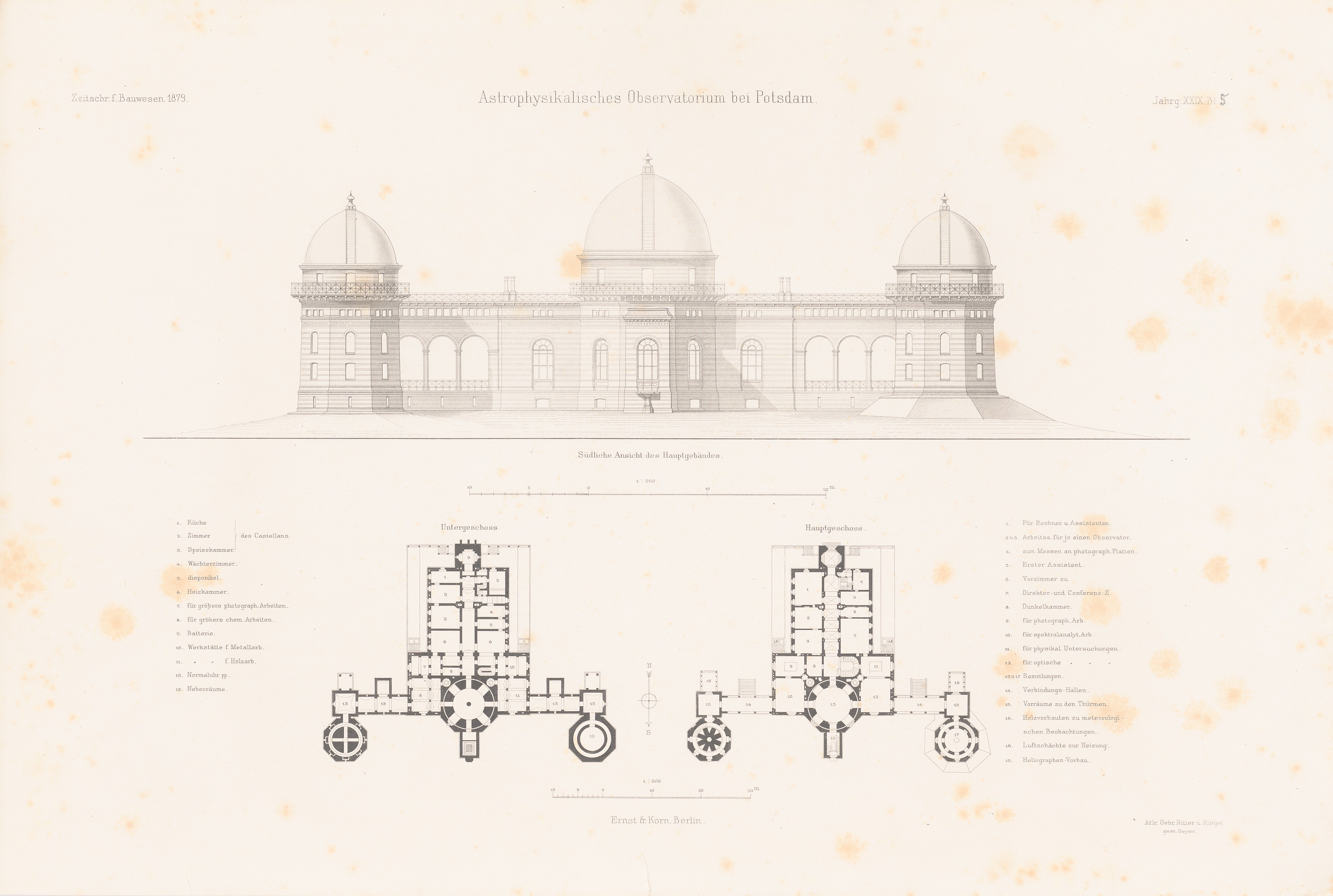 Grundriss EG, 1.OG, Ansicht von Süden (aus: Atlas zur Zeitschrift für Bauwesen, hrsg. v. G. Erbkam, Jg. 29, 1879)