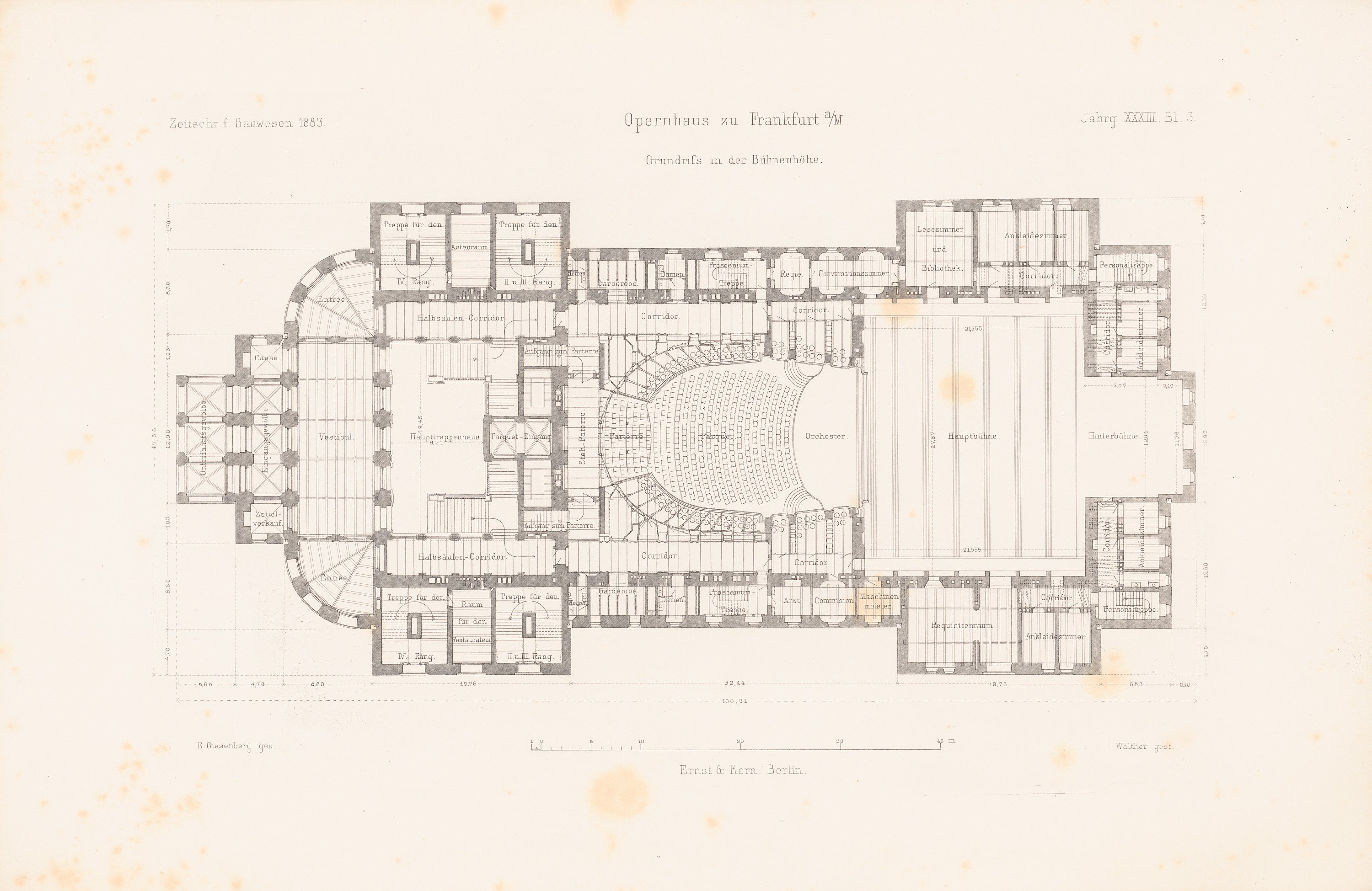 Grundriss auf Bühnenhöhe (aus: Atlas zur Zeitschrift für Bauwesen, hrsg. v. L.v.Tiedemann, Jg. 33, 1883)