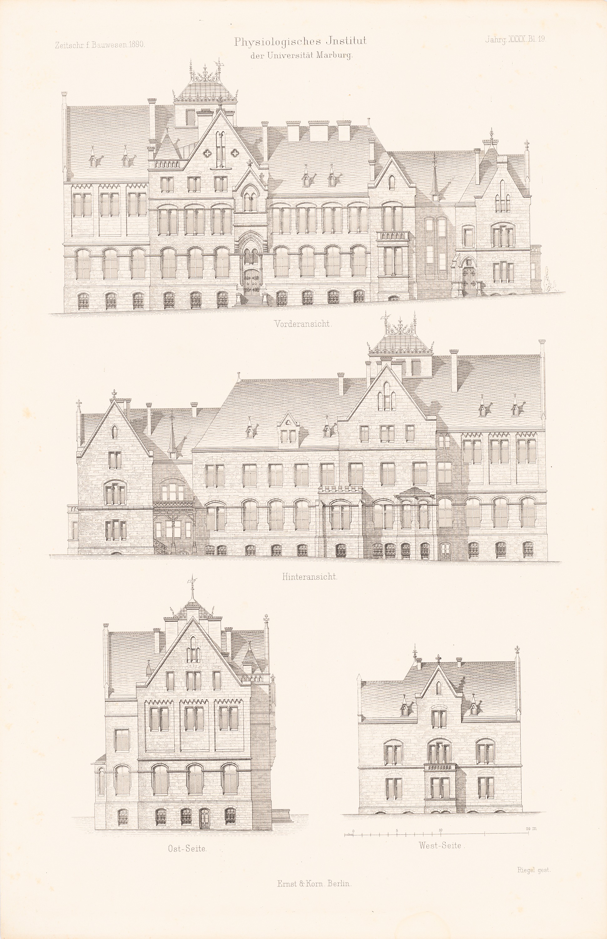 Vorderansicht, Rückansicht, Ansicht von Osten, Ansicht von Westen (aus: Atlas zur Zeitschrift für Bauwesen, hrsg. v. Ministerium der öffentlichen Arbeiten, Jg. 40, 1890)