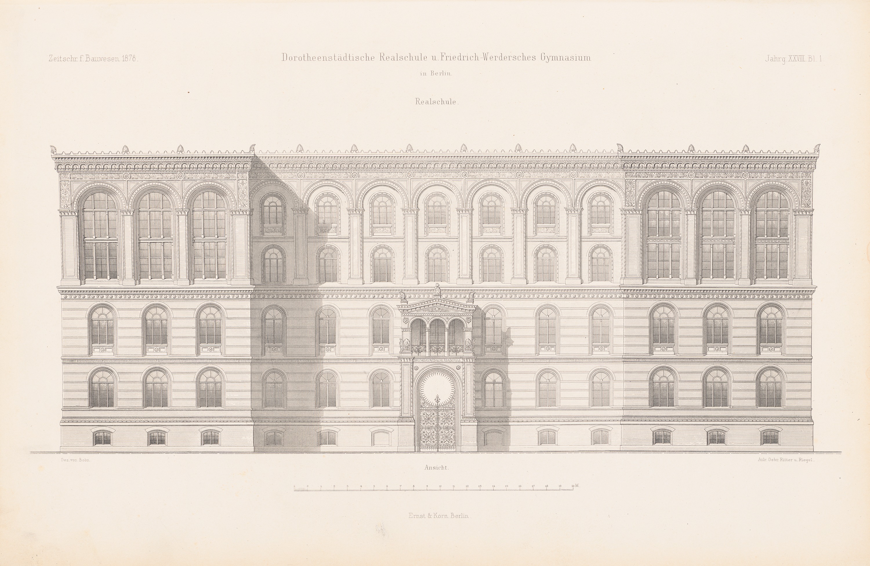 Realschule: Ansicht (aus: Atlas zur Zeitschrift für Bauwesen, hrsg. v. G. Erbkam, Jg. 28, 1878)