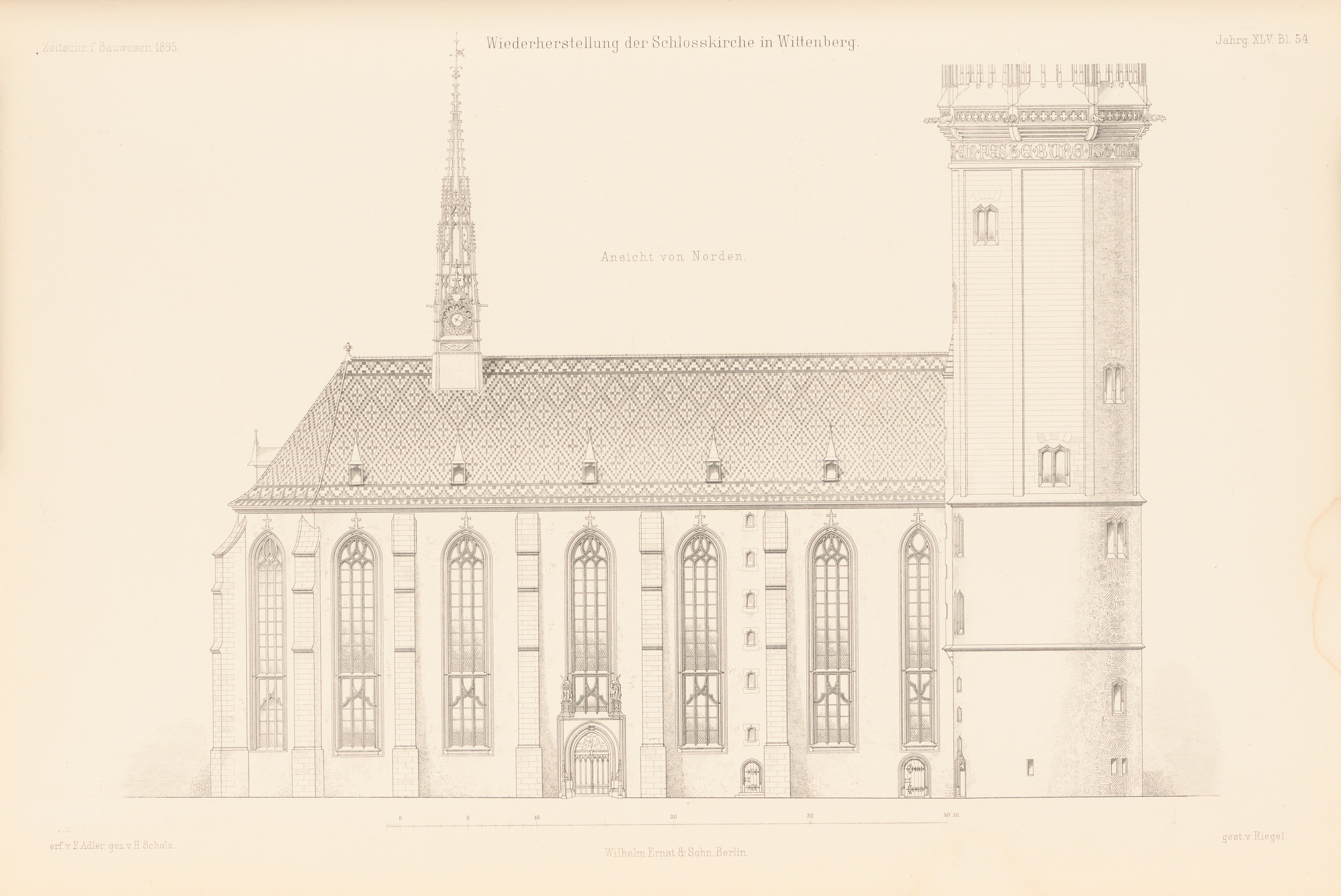 Nordansicht (aus: Atlas zur Zeitschrift für Bauwesen, hrsg. v. Ministerium der öffentlichen Arbeiten, Jg. 45, 1895)
