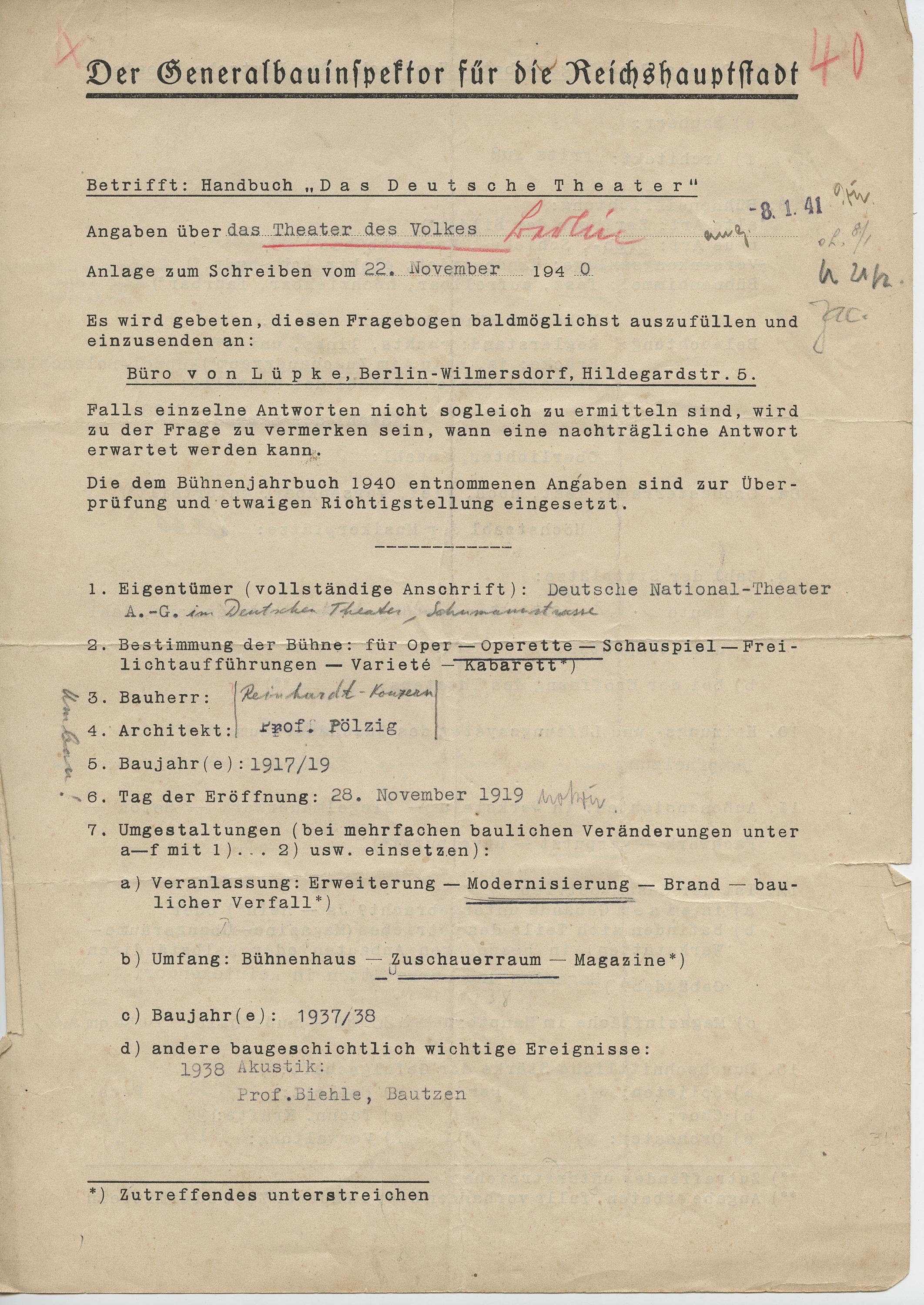 Fragebogen für das Handbuch »Das Deutsche Theater«, erste Fassung, vierseitiges Dokument