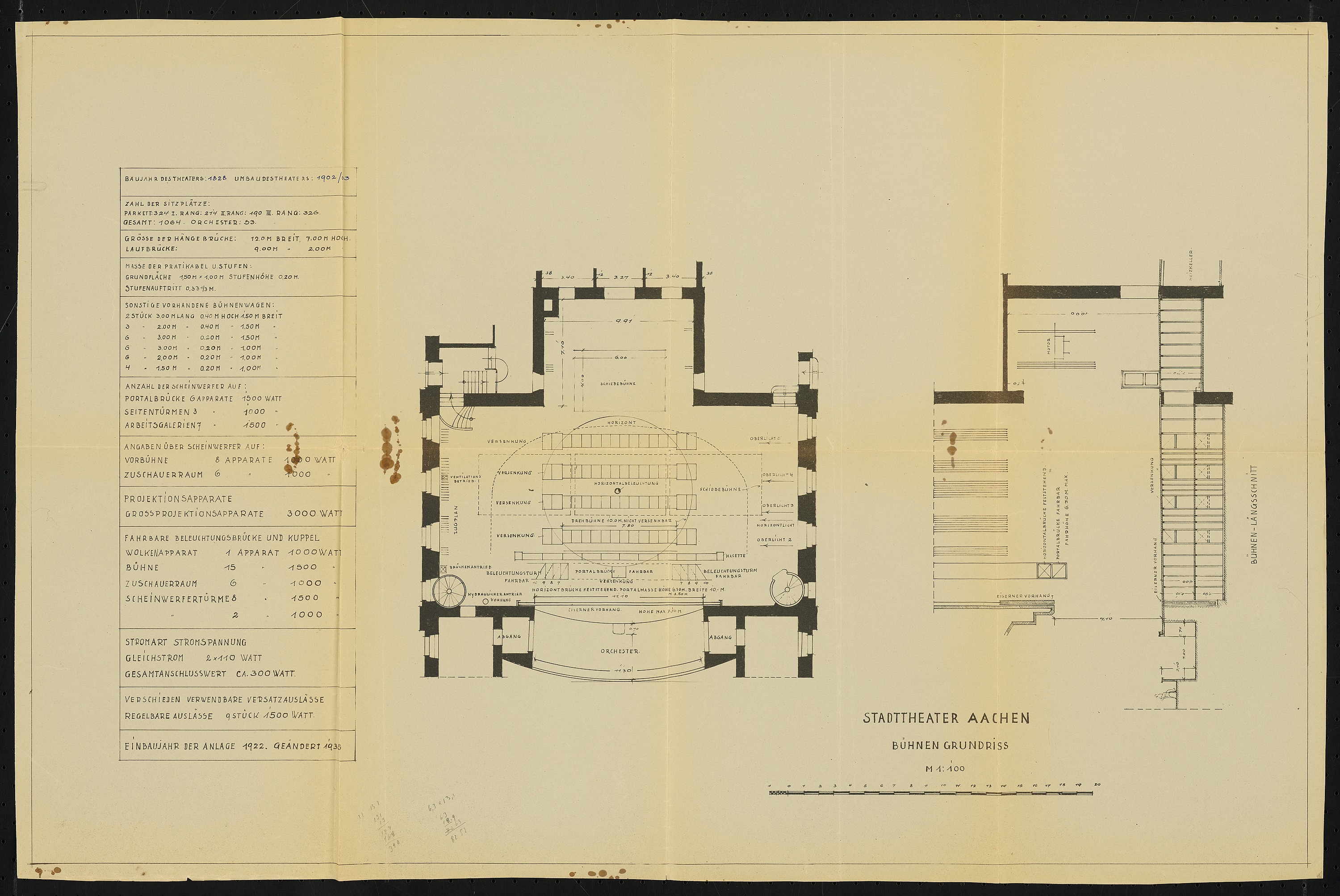 Grundriss und Längsschnitt Bühne 1:100, Informationen zur Bühnentechnik