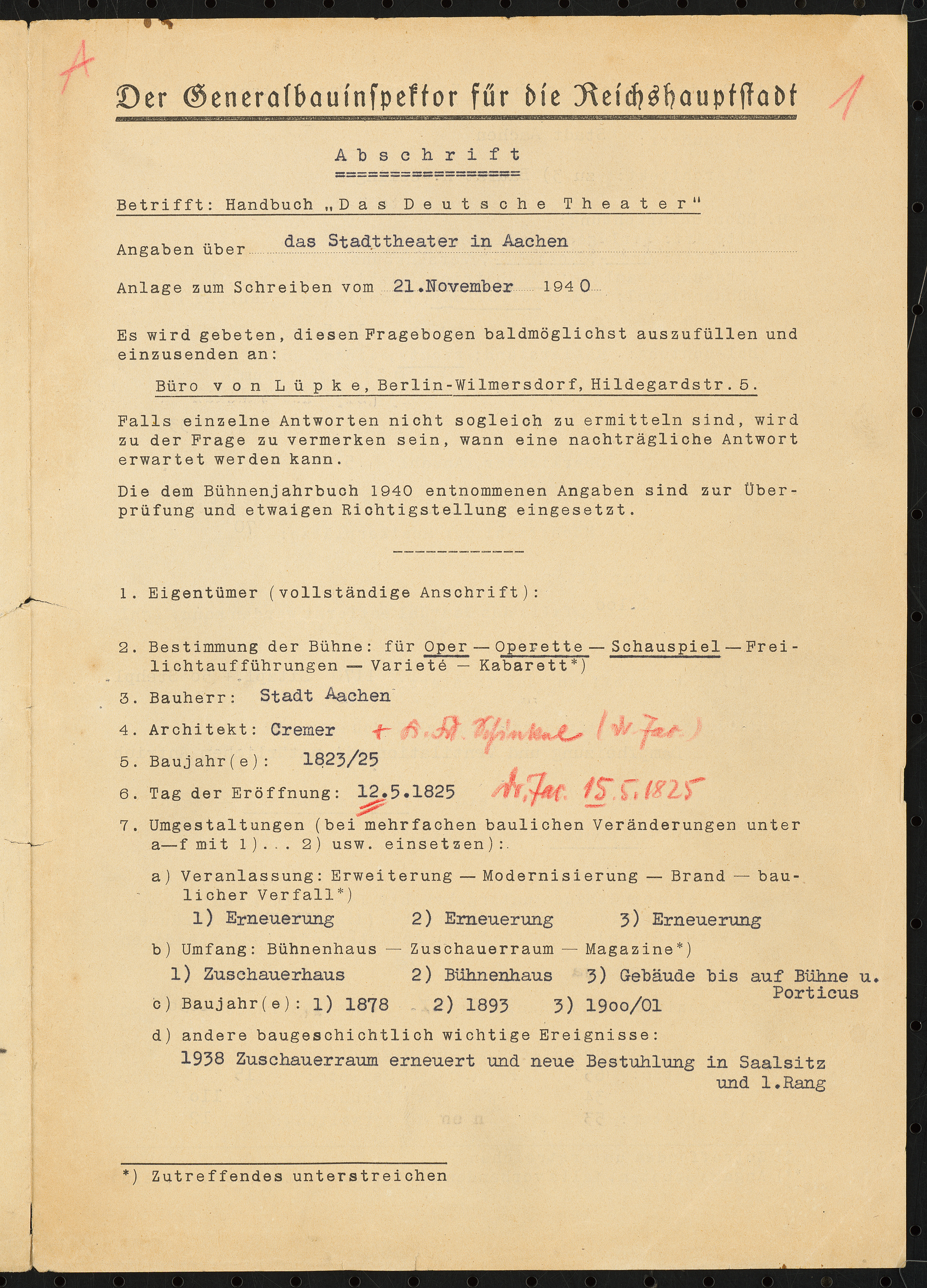 Fragebogen für das Handbuch »Das Deutsche Theater«, Abschrift, vierseitiges Dokument