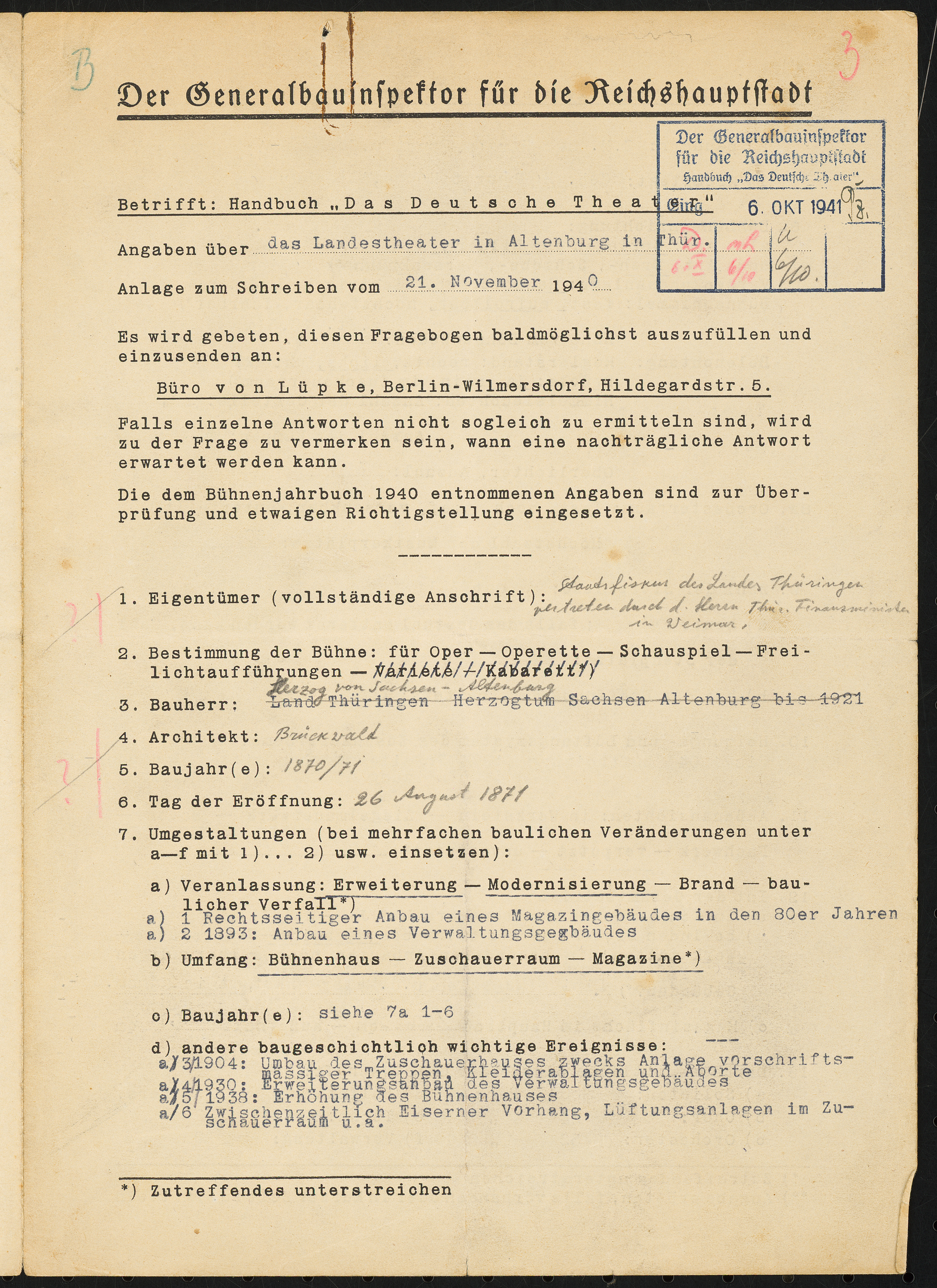 Fragebogen für das Handbuch »Das Deutsche Theater«, erste Fassung, vierseitiges Dokument