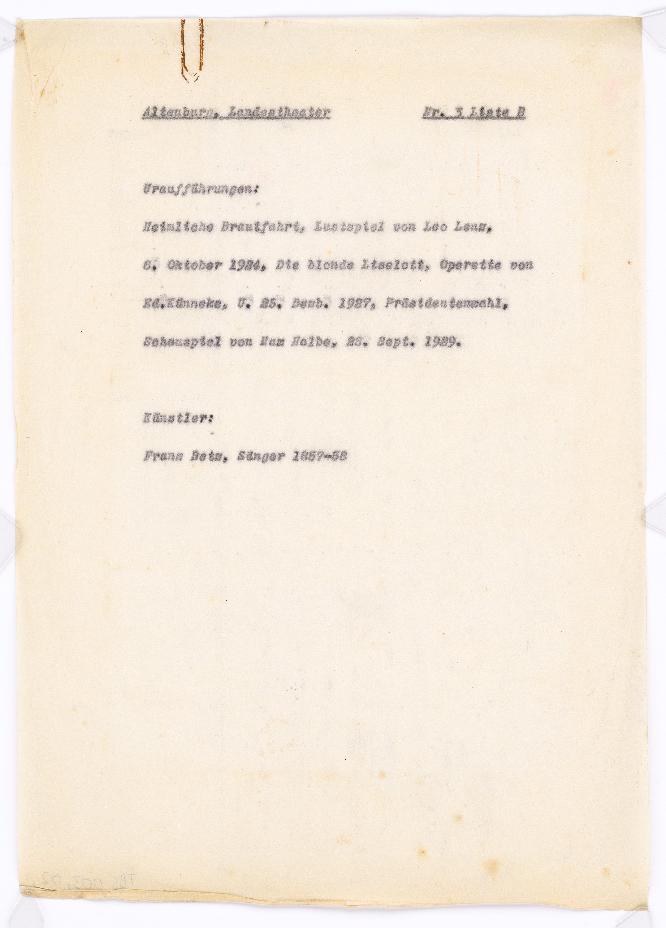 Schriftstück zum Fragebogen für das Handbuch »Das Deutsche Theater«
