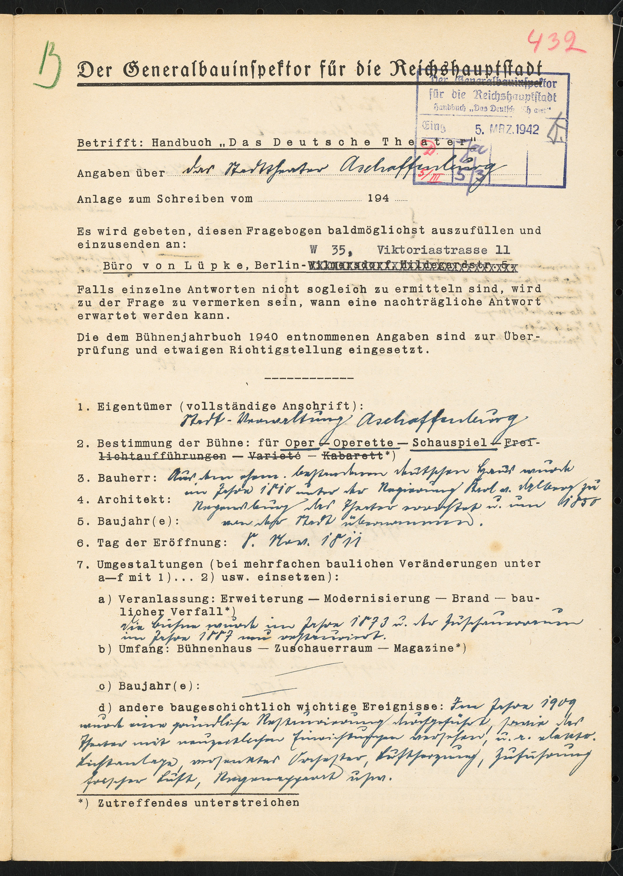 Fragebogen für das Handbuch »Das Deutsche Theater«, erste Fassung, vierseitiges Dokument