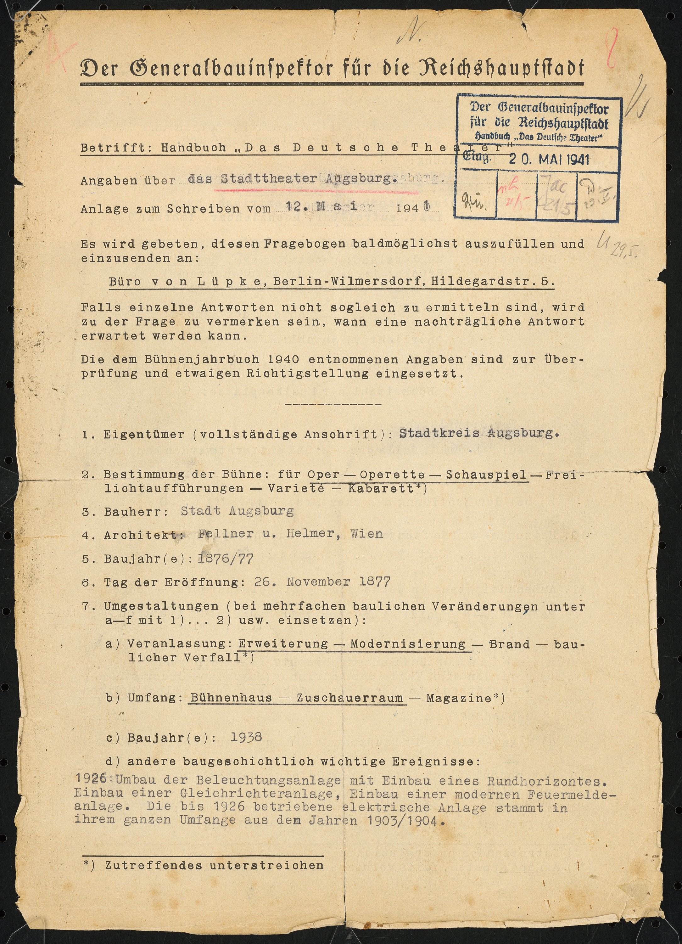 Fragebogen für das Handbuch »Das Deutsche Theater«, erste Fassung, vierseitiges Dokument