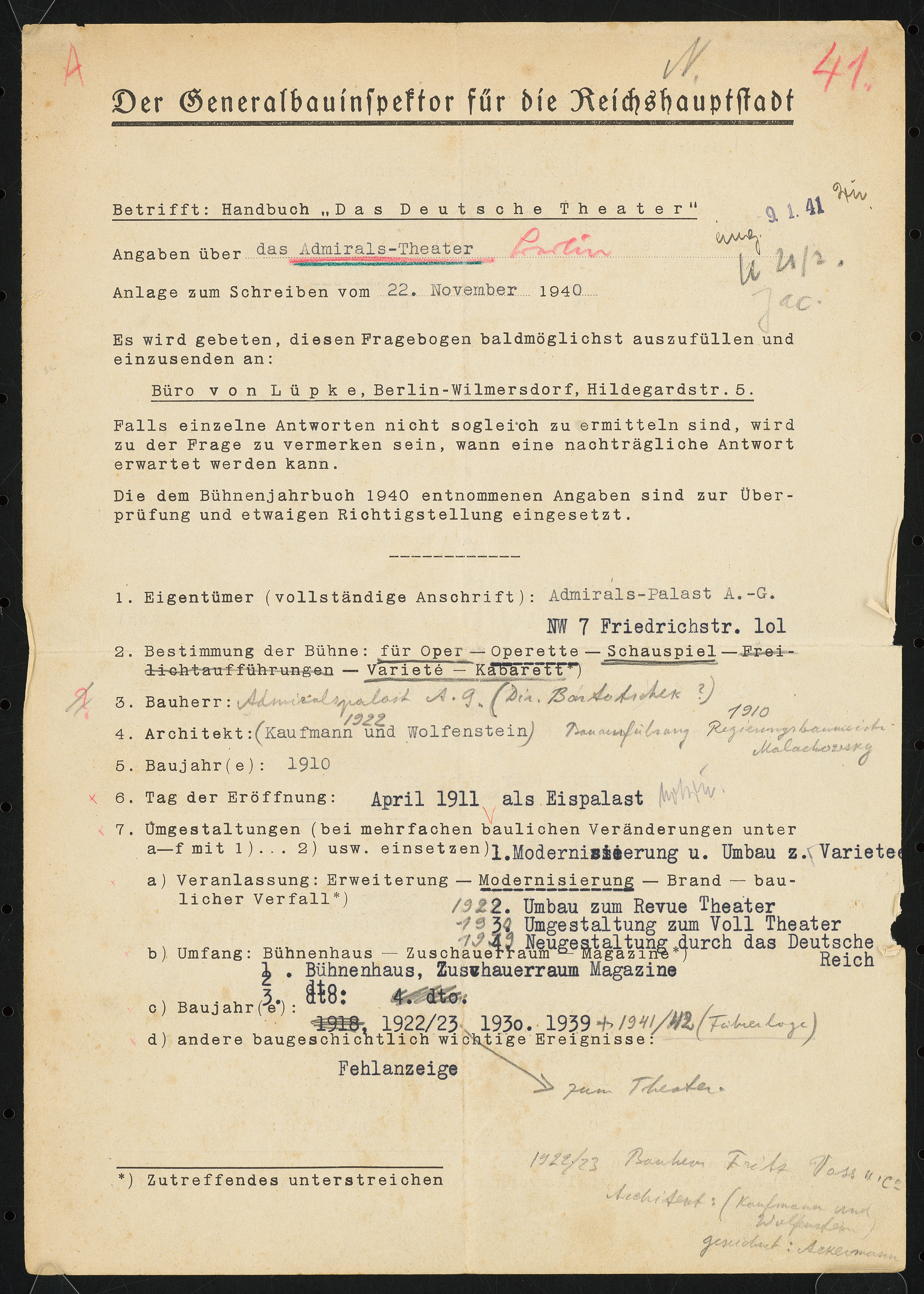 Fragebogen für das Handbuch »Das Deutsche Theater«, erste Fassung, vierseitiges Dokument