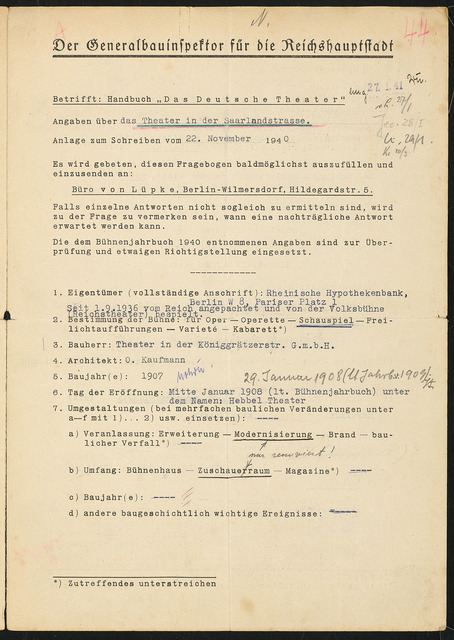 Fragebogen für das Handbuch »Das Deutsche Theater«, erste Fassung, vierseitiges Dokument
