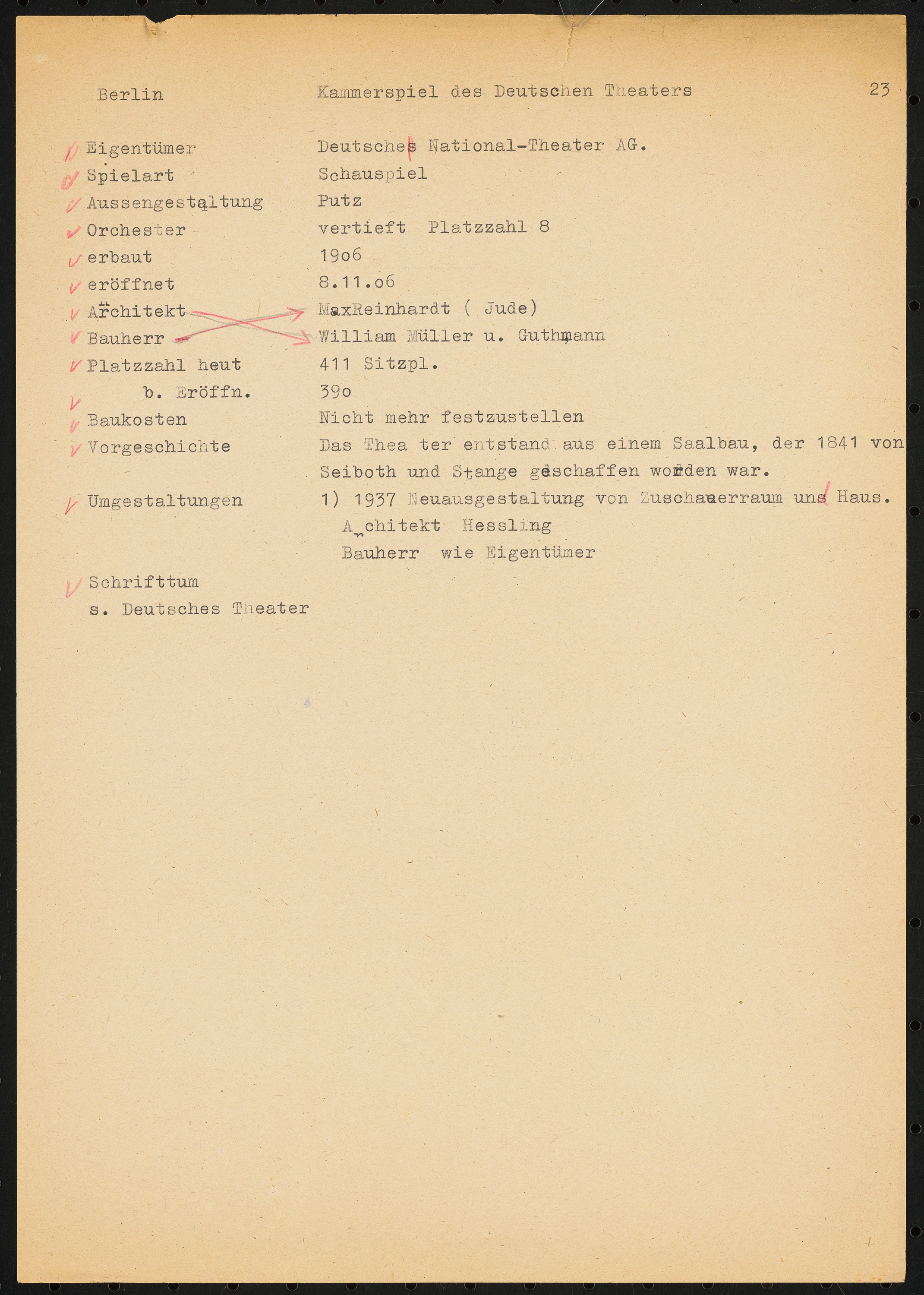 Schriftstück zum Fragebogen für das Handbuch »Das Deutsche Theater«