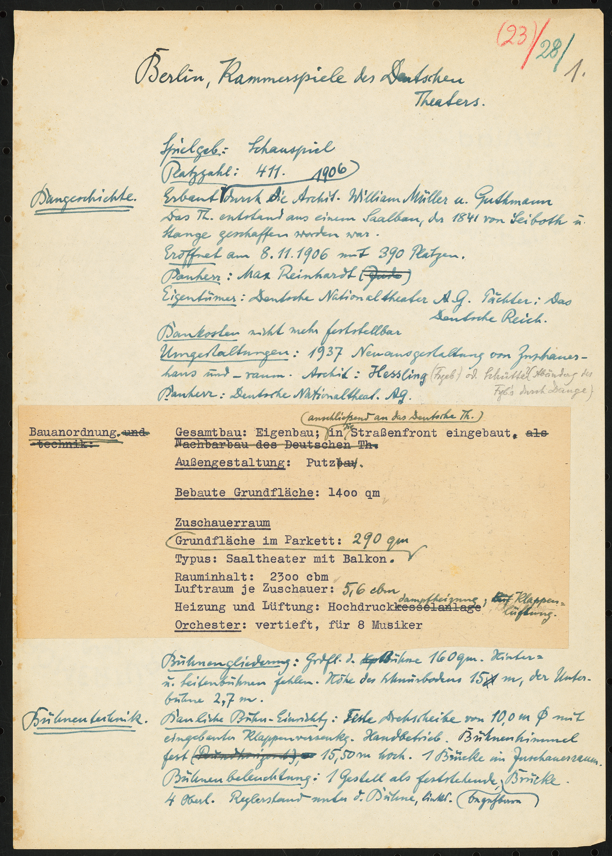 Schriftstück zum Fragebogen für das Handbuch »Das Deutsche Theater«, zwei Seiten
