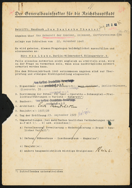 Fragebogen für das Handbuch »Das Deutsche Theater«, erste Fassung, vierseitiges Dokument