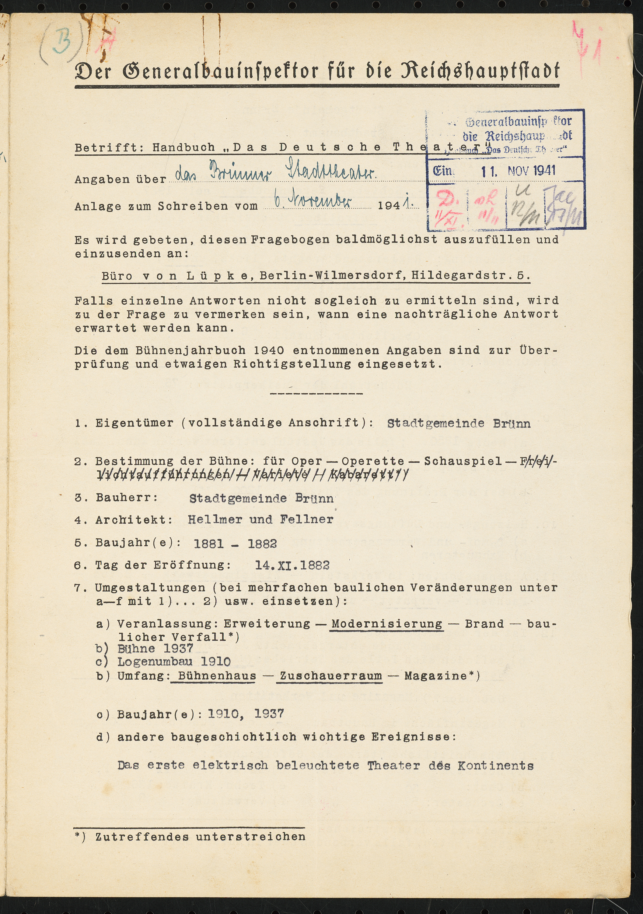 Fragebogen für das Handbuch »Das Deutsche Theater«, erste Fassung, vierseitiges Dokument