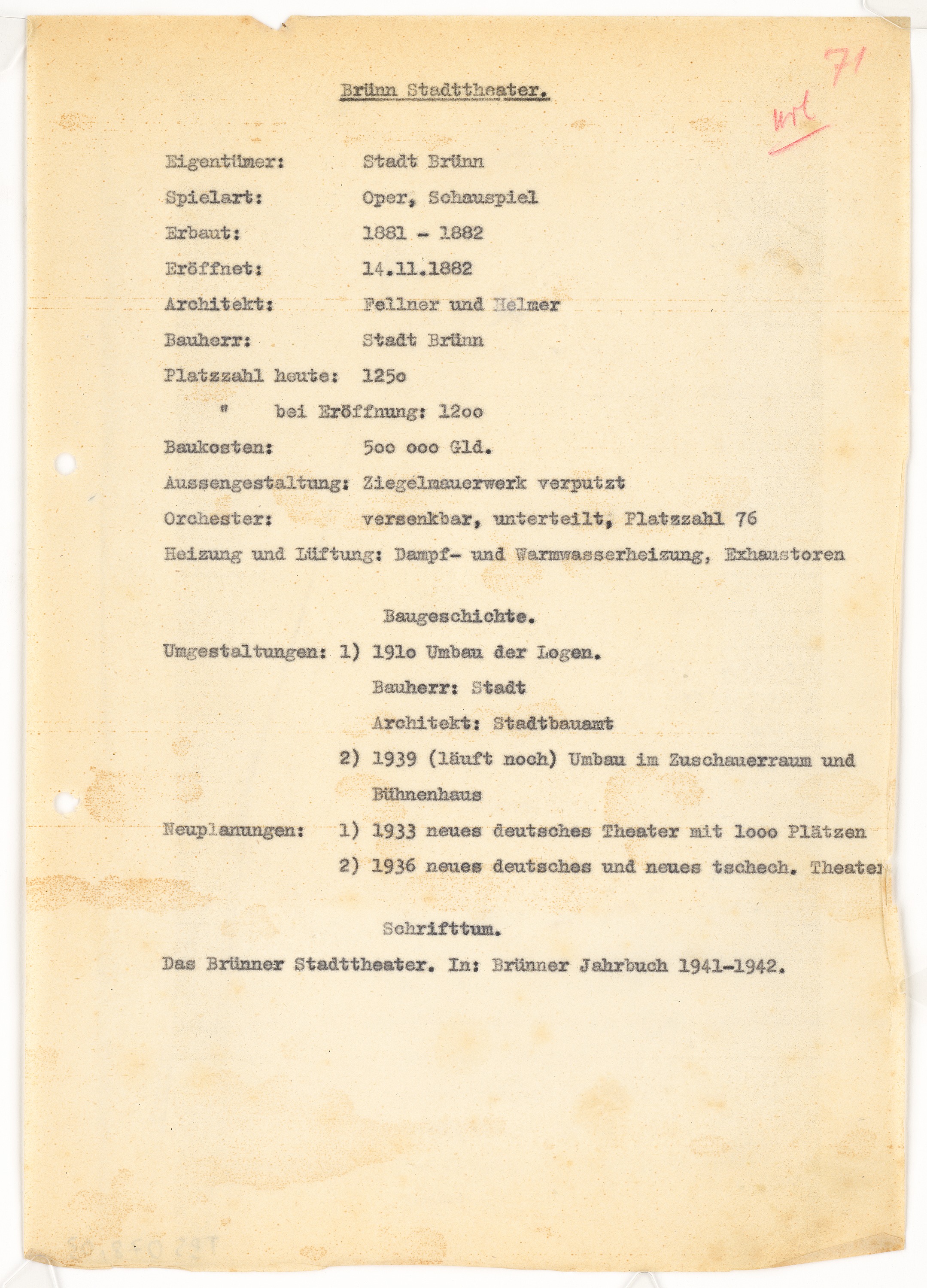 Schriftstück zum Fragebogen für das Handbuch »Das Deutsche Theater«