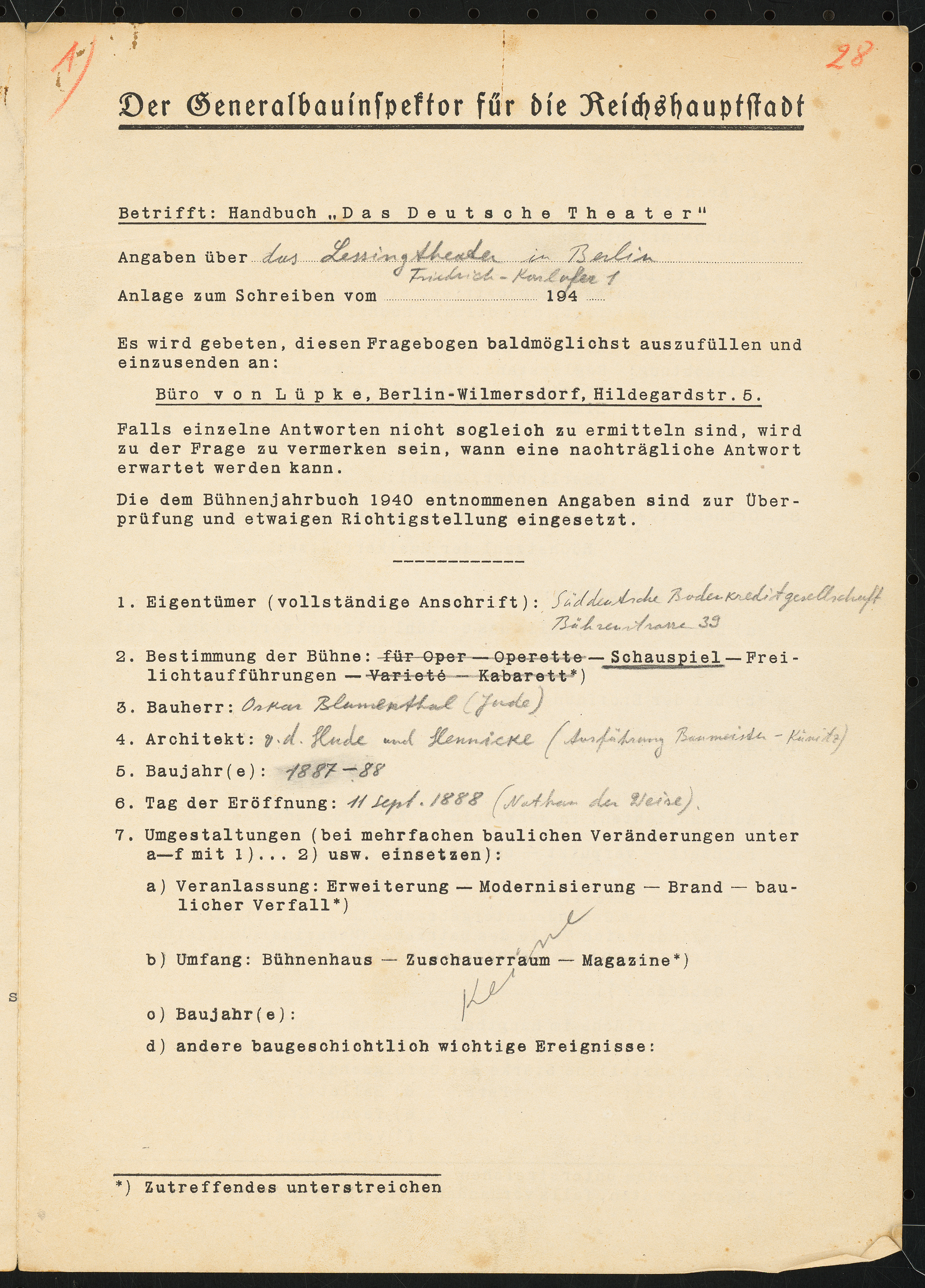 Fragebogen für das Handbuch »Das Deutsche Theater«, vierseitiges Dokument