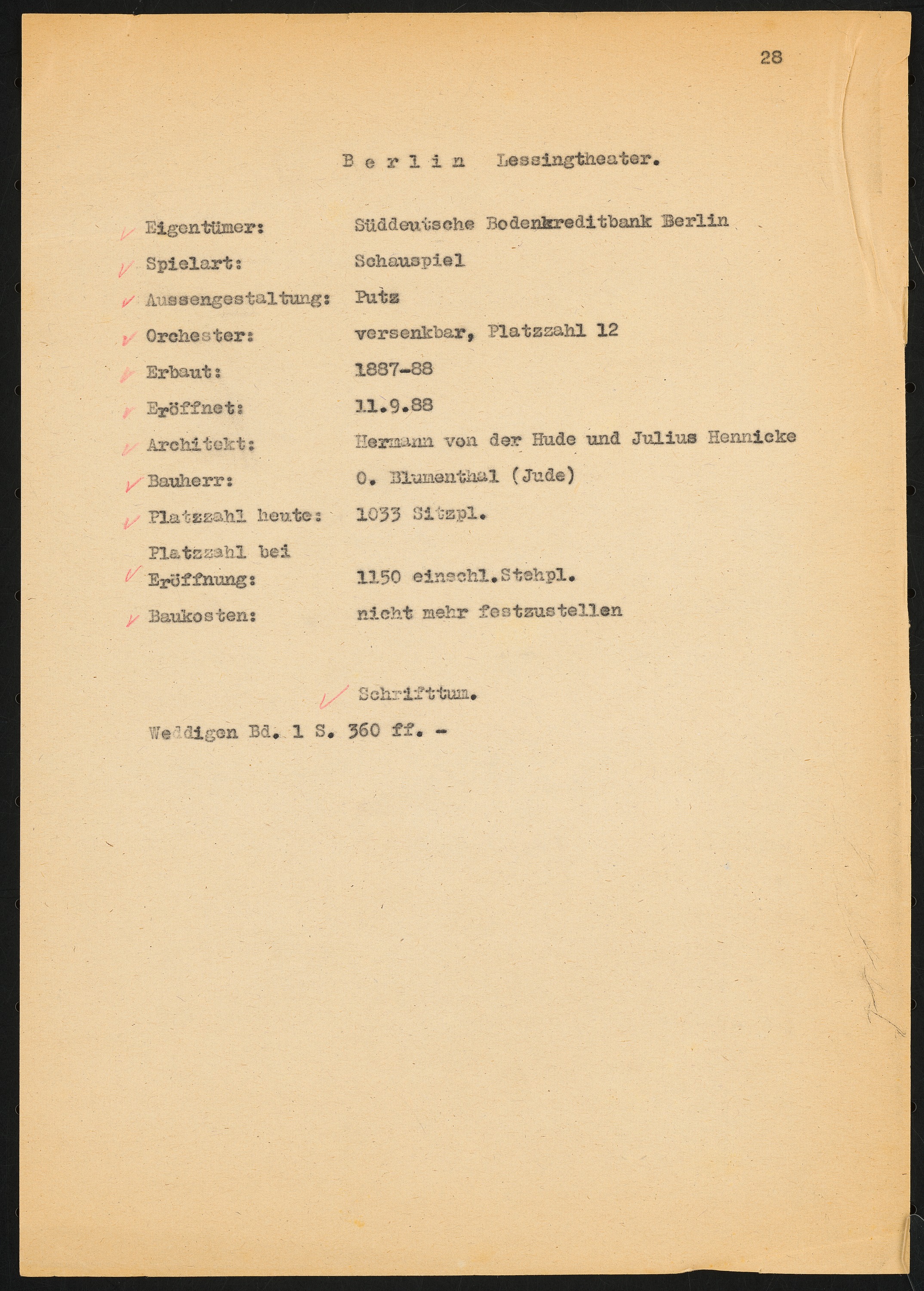 Schriftstück zum Fragebogen für das Handbuch »Das Deutsche Theater«