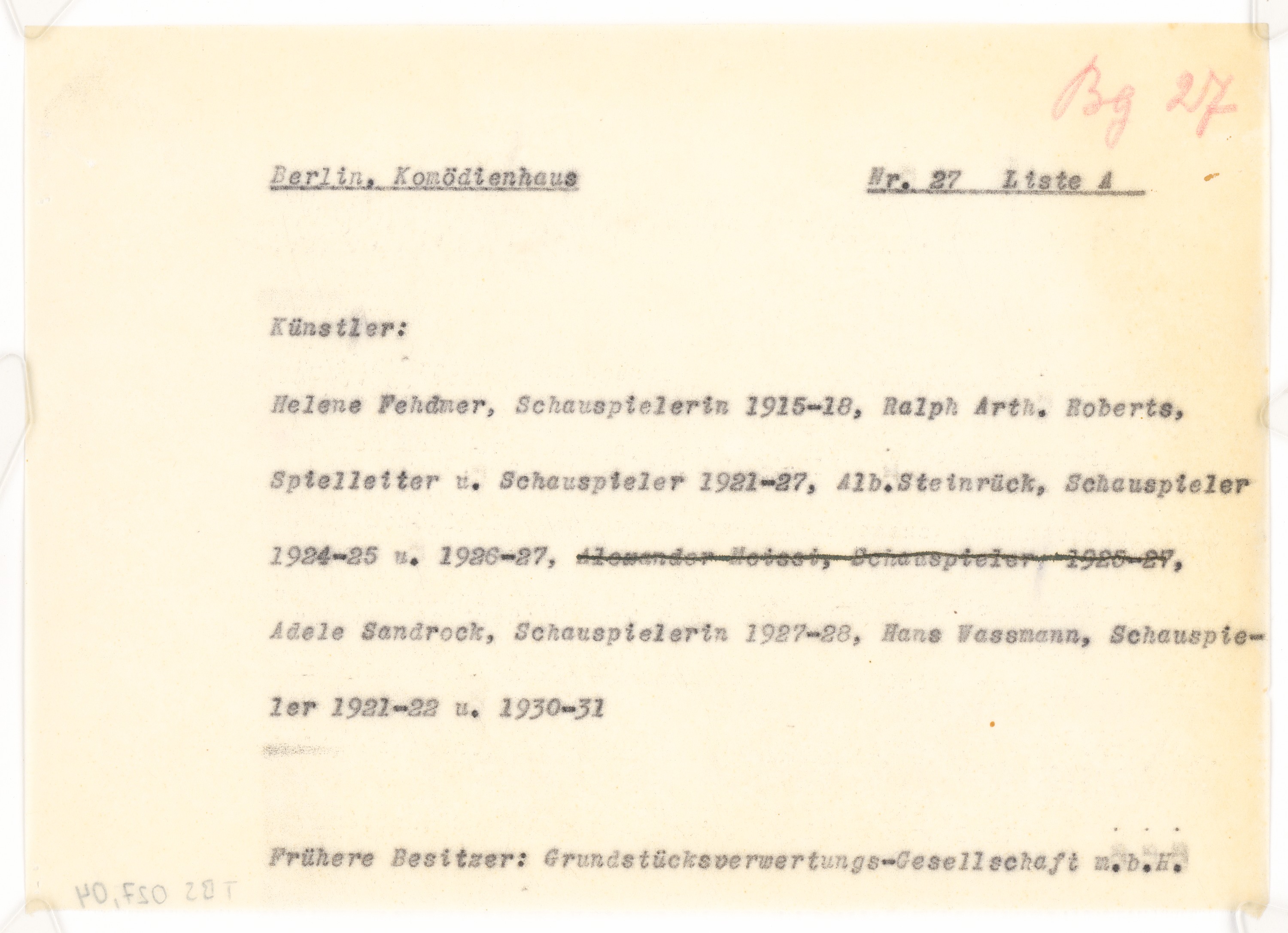Schriftstück zum Fragebogen für das Handbuch »Das Deutsche Theater«