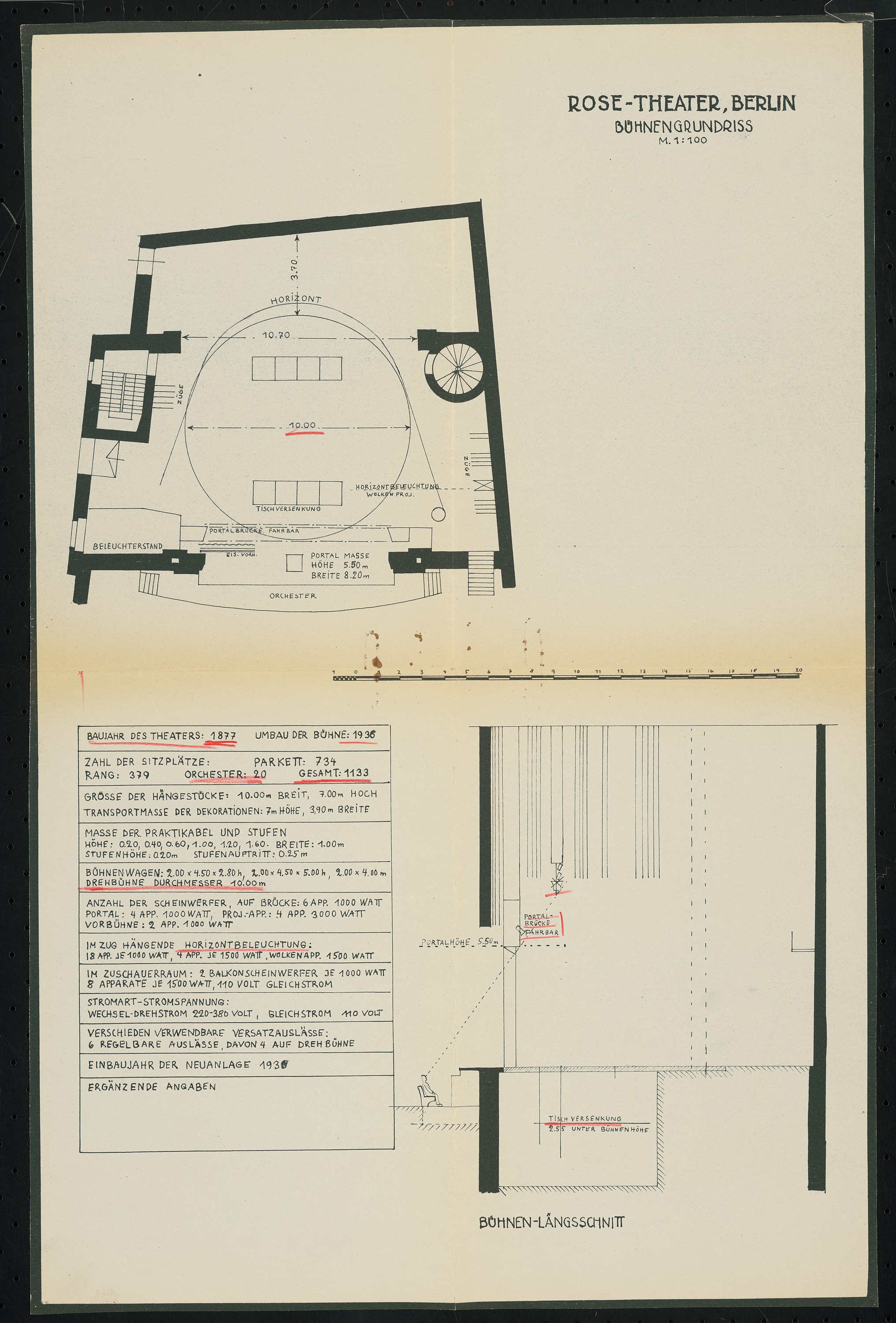 Bühnengrundriss und Bühnenlängsschnitt 1:100
