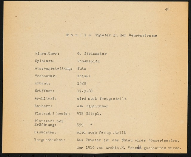 Schriftstück zum Fragebogen für das Handbuch »Das Deutsche Theater«