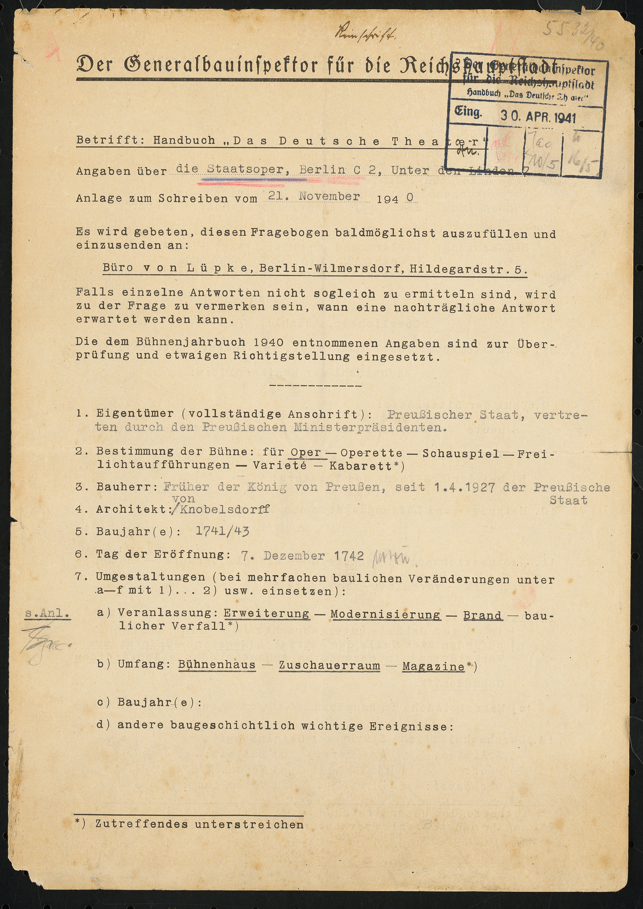 Fragebogen für das Handbuch »Das Deutsche Theater«, vierseitiges Dokument