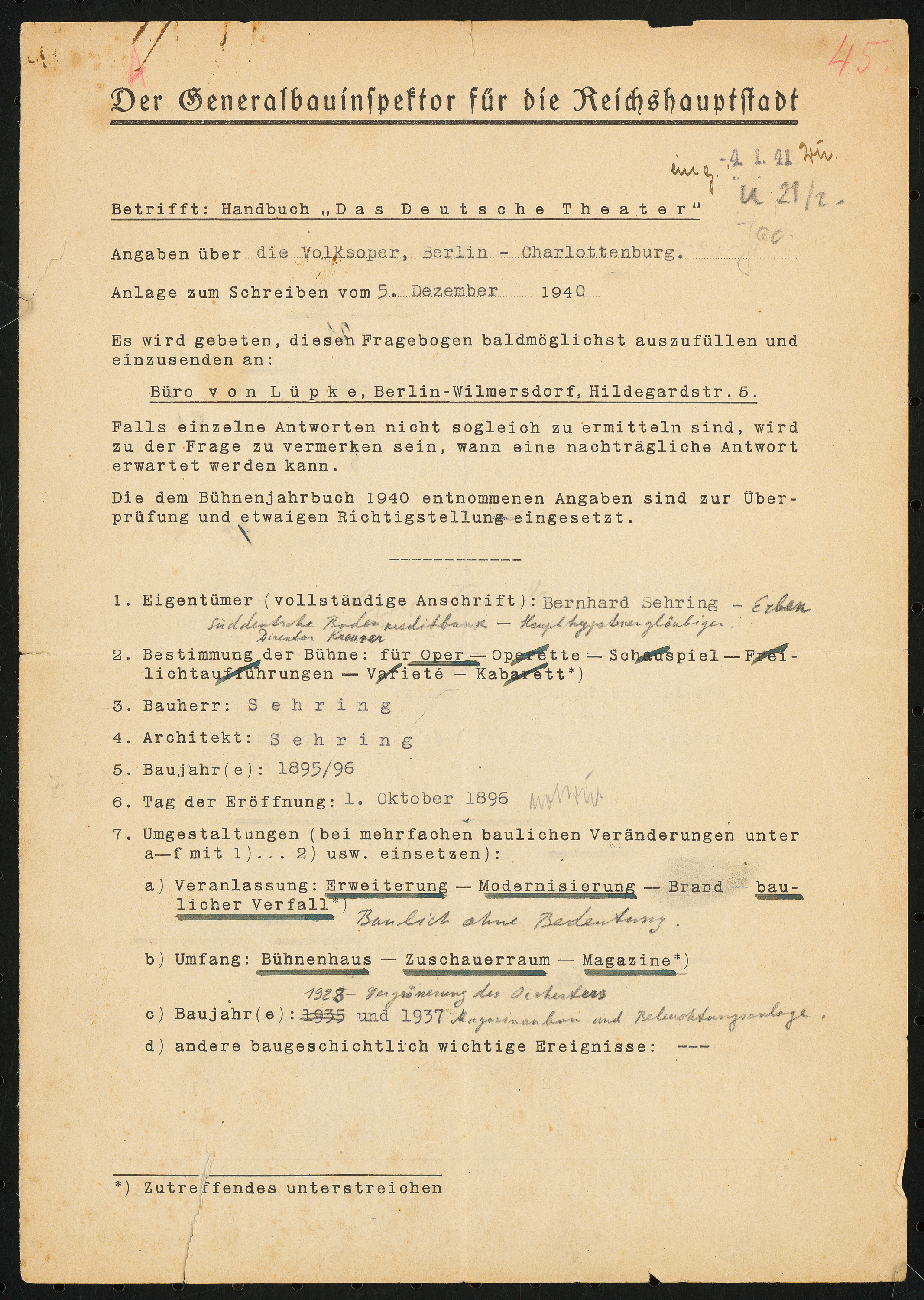 Fragebogen für das Handbuch »Das Deutsche Theater«, vierseitiges Dokument