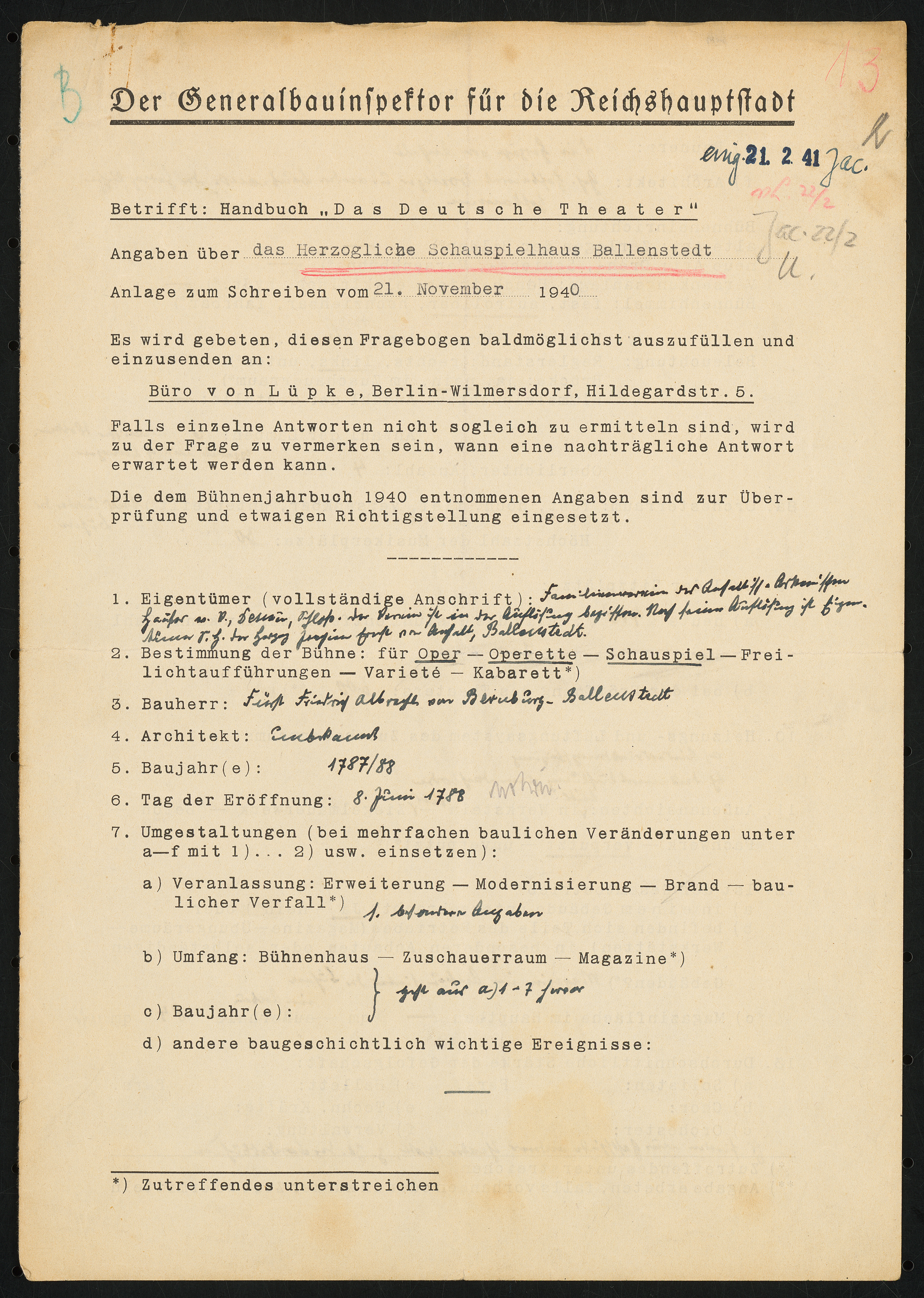 Fragebogen für das Handbuch »Das Deutsche Theater«, vierseitiges Dokument