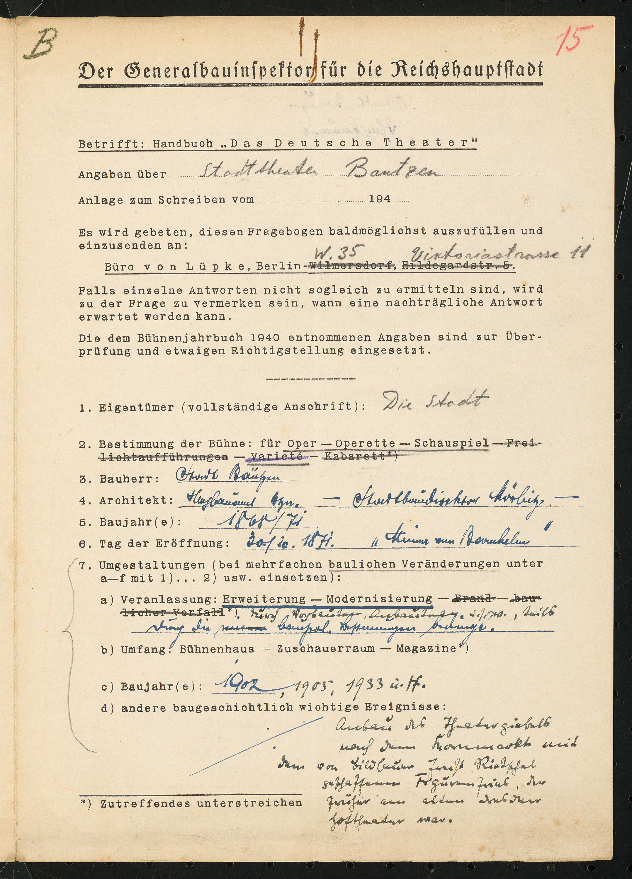 Fragebogen für das Handbuch »Das Deutsche Theater«, vierseitiges Dokument