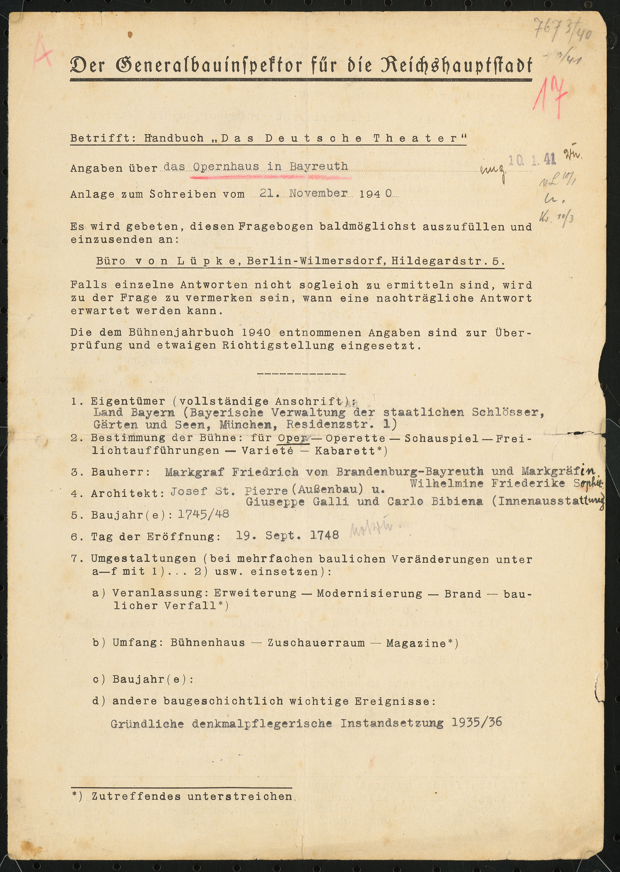 Fragebogen für das Handbuch »Das Deutsche Theater«, vierseitiges Dokument