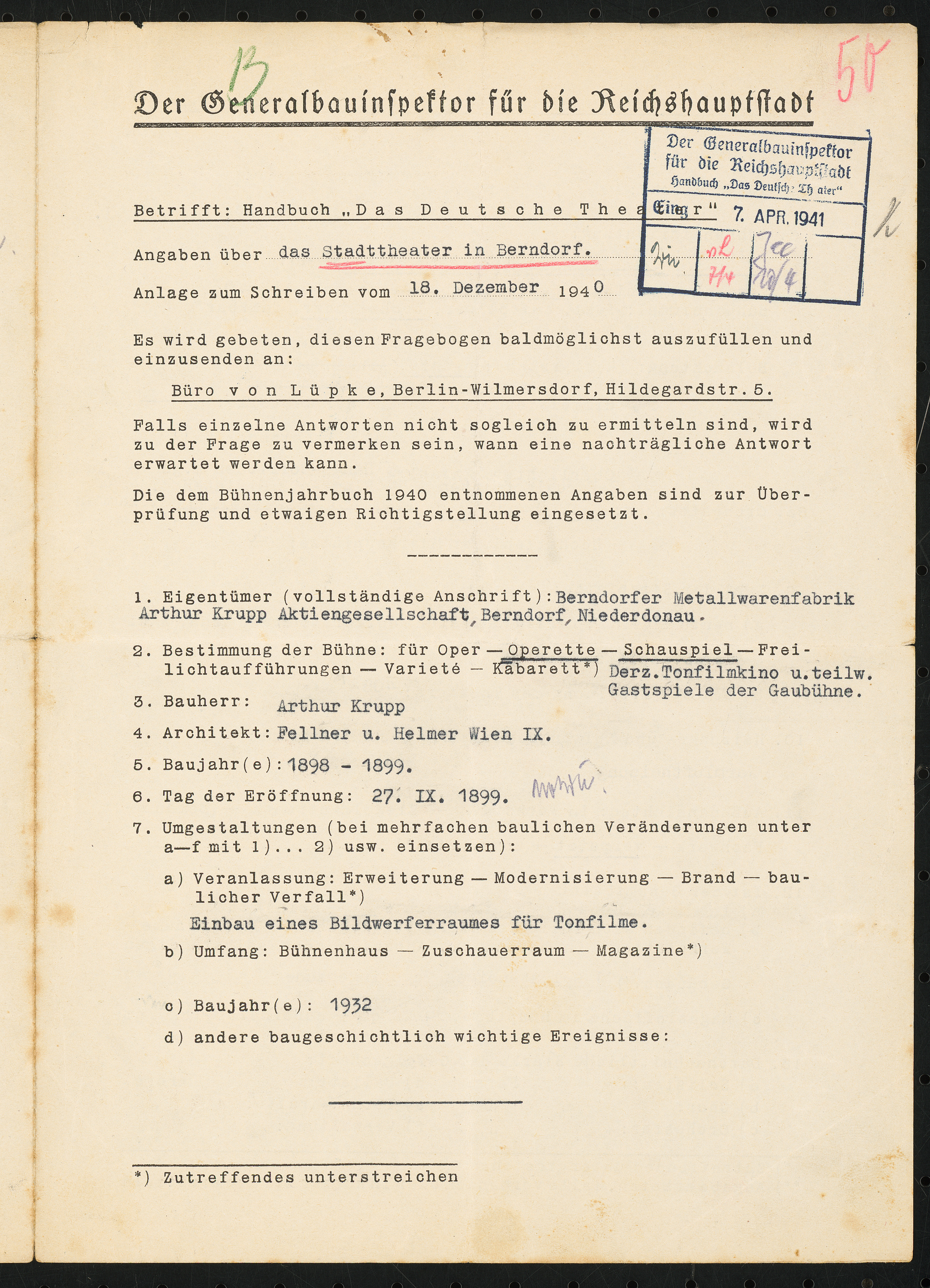 Fragebogen für das Handbuch »Das Deutsche Theater«, vierseitiges Dokument