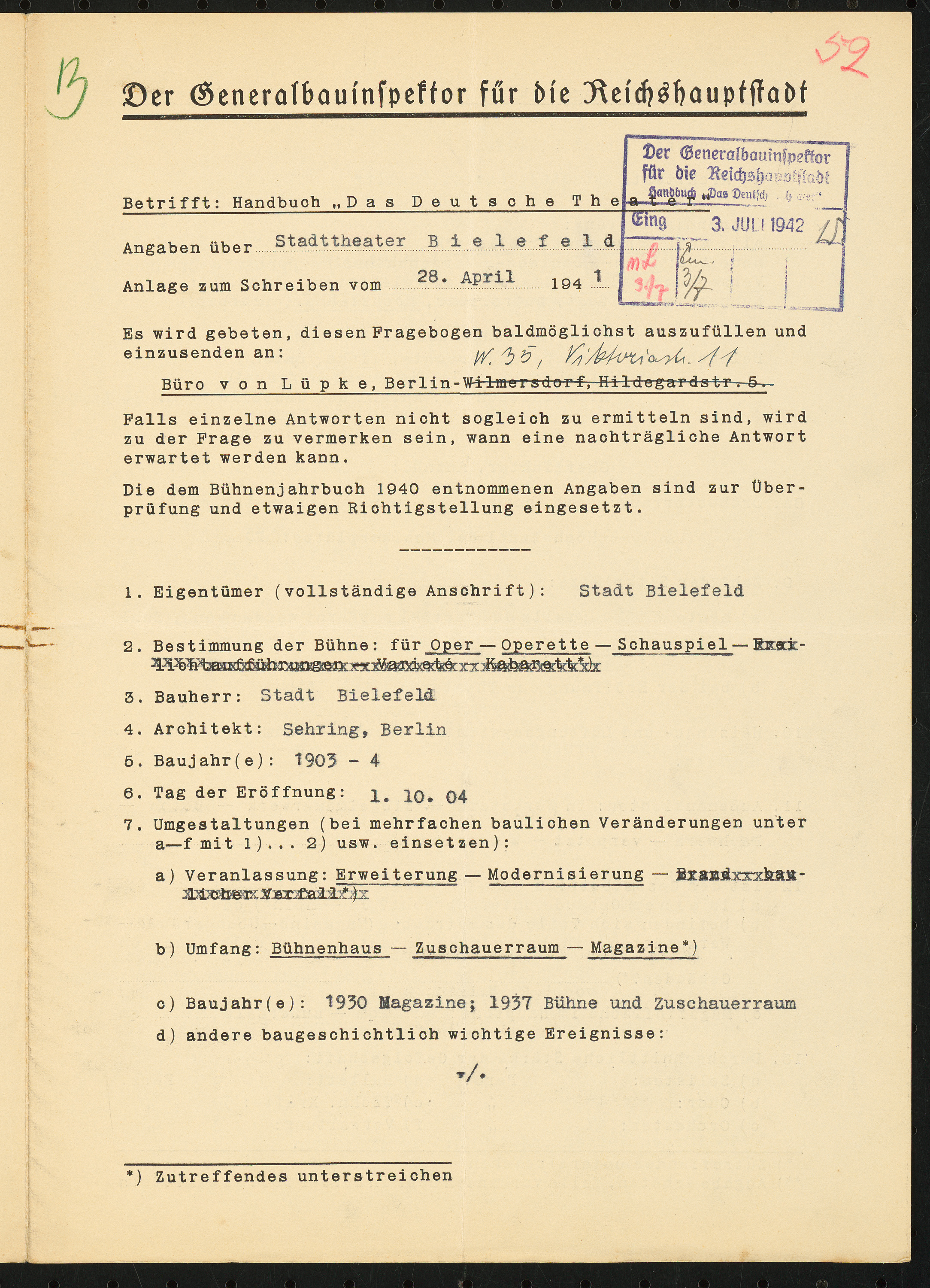 Fragebogen für das Handbuch »Das Deutsche Theater«, vierseitiges Dokument