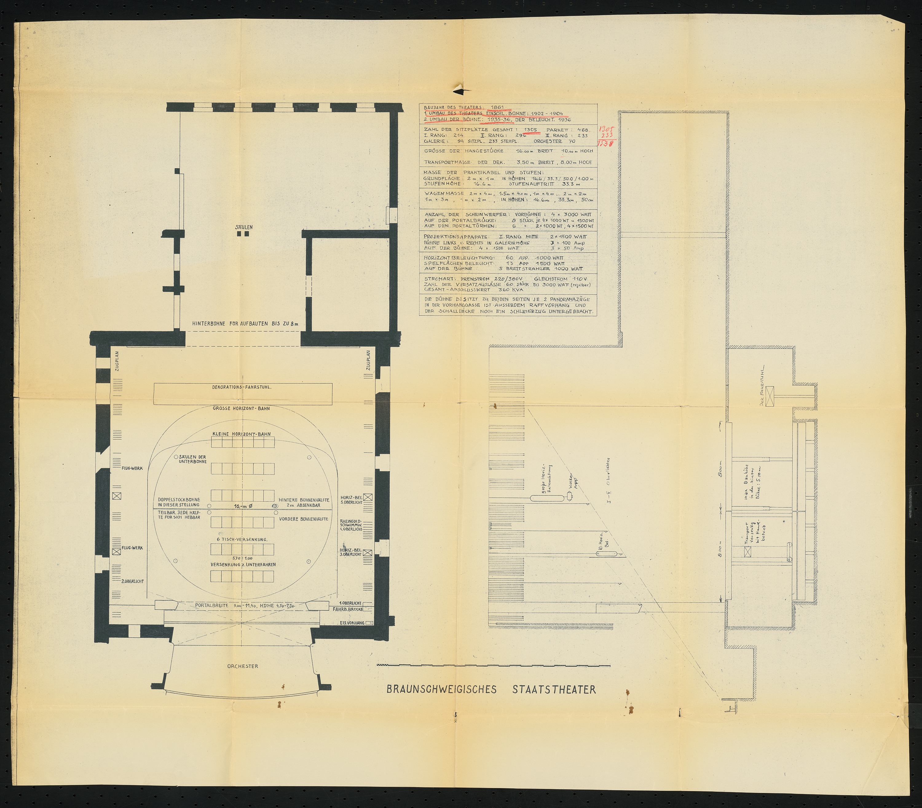 Bühnengrundriss und Bühnenlängsschnitt 1:100