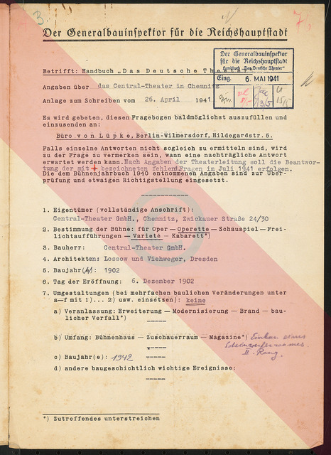 Fragebogen für das Handbuch »Das Deutsche Theater«, vierseitiges Dokument