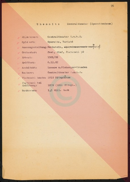 Schriftstück zum Fragebogen für das Handbuch »Das Deutsche Theater«